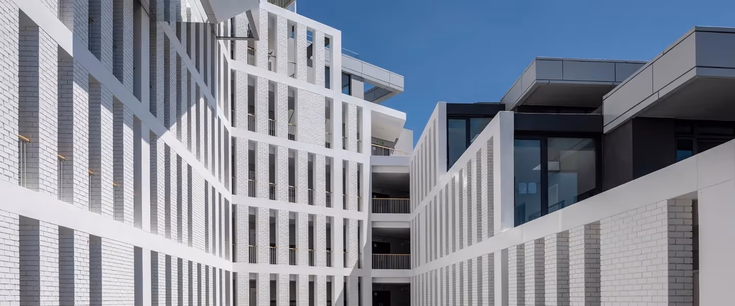 Due to the negative space created by the building form wrapping on itself, at the heart of the building is a deep fissure. This deep 30m x 13m space acts as a light chasm. It catches the north light and delivers it down to the lowest floors. At the base is a courtyard which is made up of a white-painted face brick fenestration. As a result, it creates an alternate world inside the building. Furthermore, the rustic textured nature of this area intentionally complements the smooth, sleek external cladding.