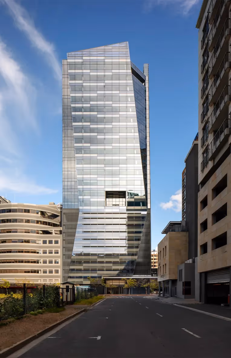The result is a building characterised by a singular sculpted massing with dynamic glazed façades that extend seamlessly over the office’s floors and parking levels. The façade terminates above ground level to emphasise and activate the street edge, particularly along entire length of the street frontage along Lower Long and Jetty Streets. This is enlivened by retail units at ground level, multiple entry points to the office building and a prominent double-volume main entrance.