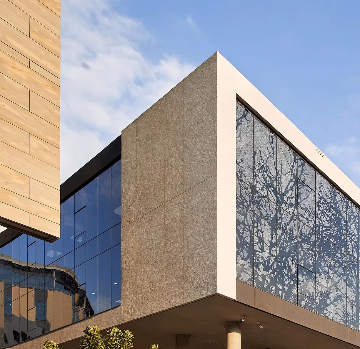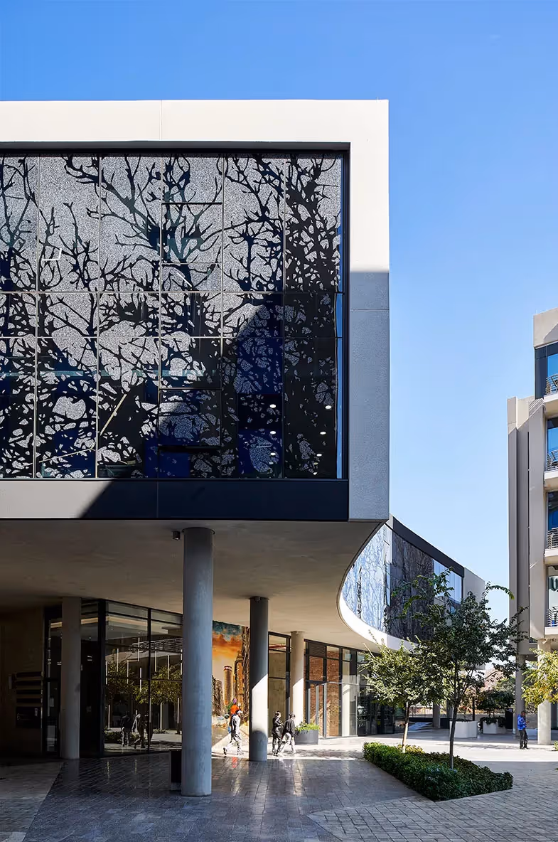 Our solution was to establish a distinctive façade of fritted glass featuring a pattern of trees inspired by Johannesburg’s urban forest, reflecting Arup’s focus on sustainable development. We applied a specific focus on the contrast between light and dark frames surrounding the glazed area, creating interest and maintaining focus and energy on the façade.