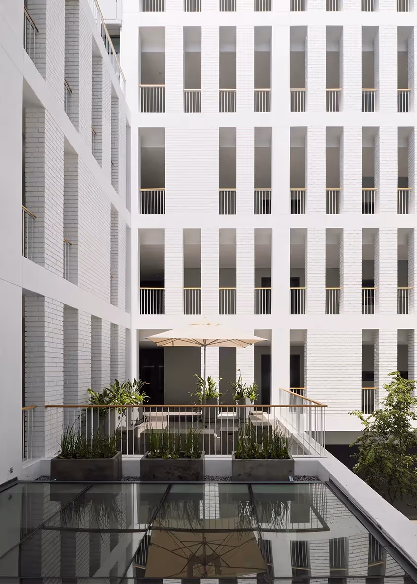 A deep fissure at the heart of the building creates a contrasting negative space as the building form wraps around itself. This deep 30m x 13m space acts as alight chasm that catches the north light and delivers it through the whole building to the lowest floors. At the base is a courtyard made up of a white-painted face brick fenestration that creates an alternate world inside the building. The rustic textured nature of this area was intentionally designed to complement the smooth, sleek external cladding. A series of transparent glazed commercial and public spaces surround the courtyard. The courtyard spills out onto landscaped gardens, offering 360-degree views and connecting the internal areas to the outside environment. Inside the courtyard, a highly reflective aluminum material wraps the bottom escape staircase, emulating a mirror, and challenging residents to look up.