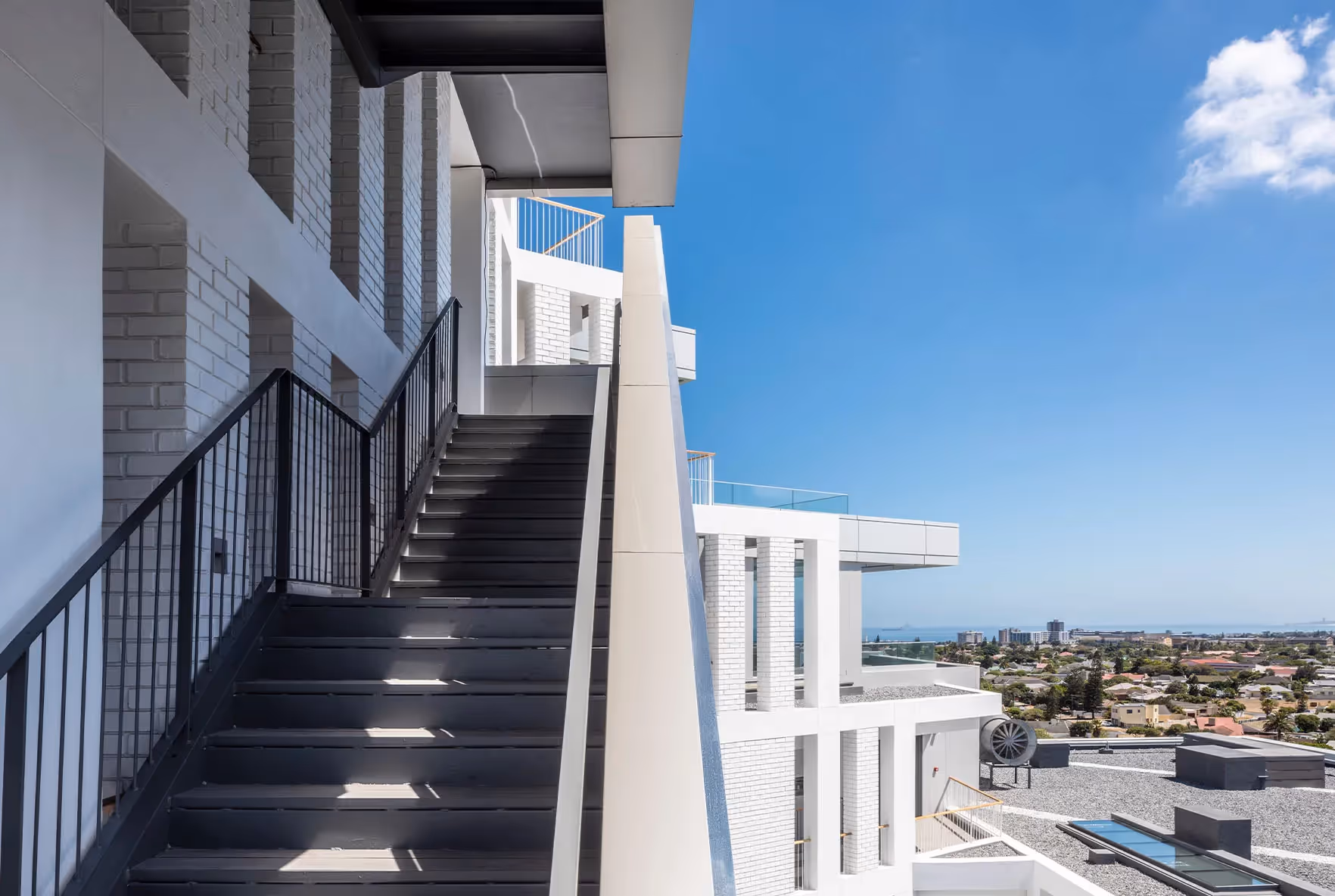 The compact form of the building wraps around itself and rises gradually to its full 11storey height. Consequently, most apartments are oriented towards views of Cape Town and the mountain. Visual ‘gashes’ add interest to the façade. The unique doughnut-shaped structure includes sheltered walkway spaces that offer glimpses of the city and offer a sense of connection with the outside world. The rising form cuts away, creating dynamic terraces and activity at differing heights, culminating in generous penthouse units.
