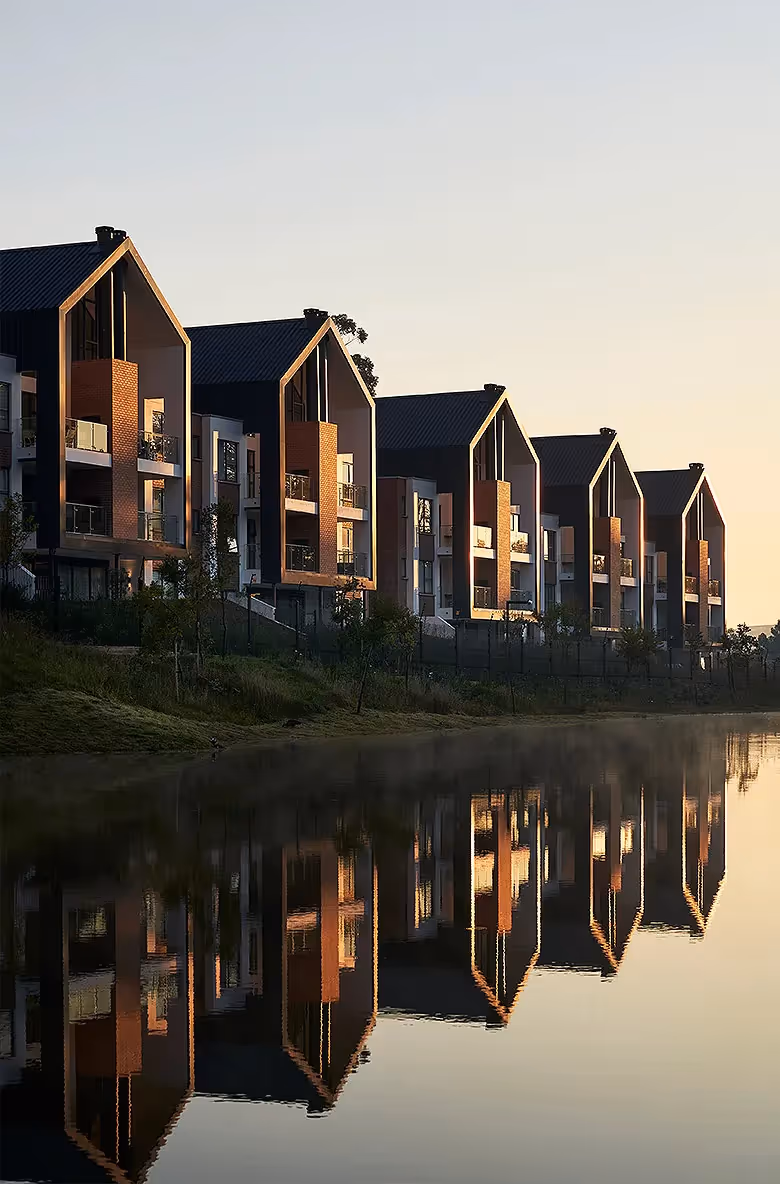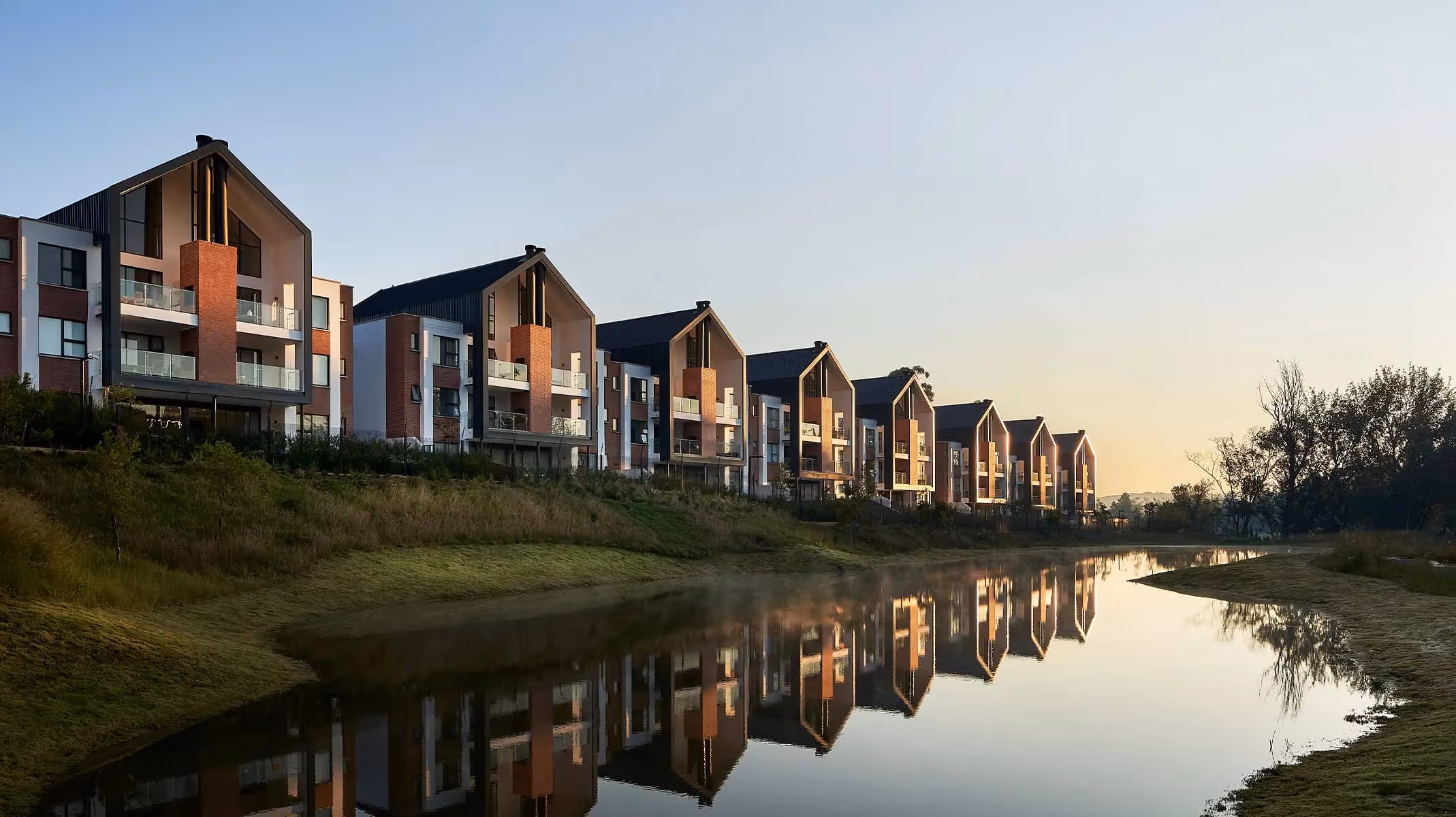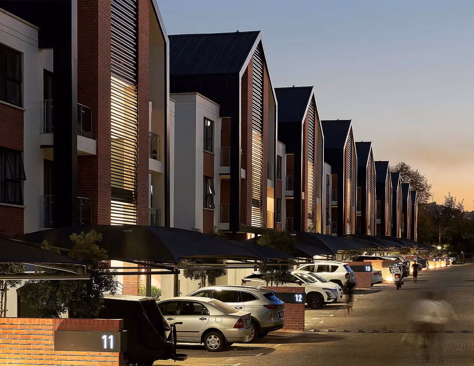 Brookfield at Royal in Johannesburg is the first luxury apartment development to be situated within the precinct of the Royal Johannesburg and Kensington Golf Club. The development is set out on a long, narrow, sloping site alongside the golf course, arranged in a linear form that follows the contours of the land. Each block consists of three-storey walk-up structures, typically arranged in clusters of six to eight units. Each cluster features a symmetrical layout with two-bedroom apartments on the ground and first floors, and loft units on the top floor with bedrooms and living spaces split between two levels.