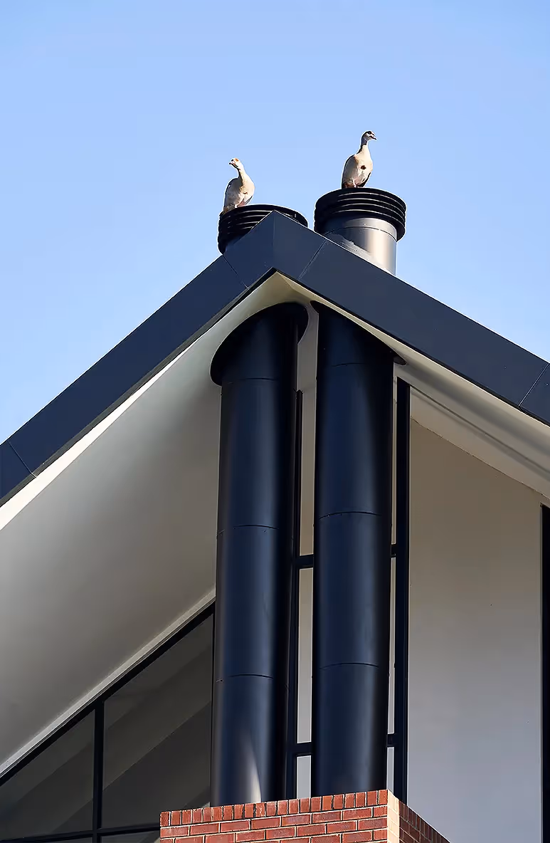 Open gables on one side house entrances and vertical circulation, with balconies facing on to landscaped parking. Gables on the other side feature expansive glazing and steel-and-glass balconies overlooking the golf course, with vertical brick barbecue columns forming privacy dividers between units. Each unit is crowned by twin steel chimney pipes, forming an iconic leitmotif throughout the scheme.