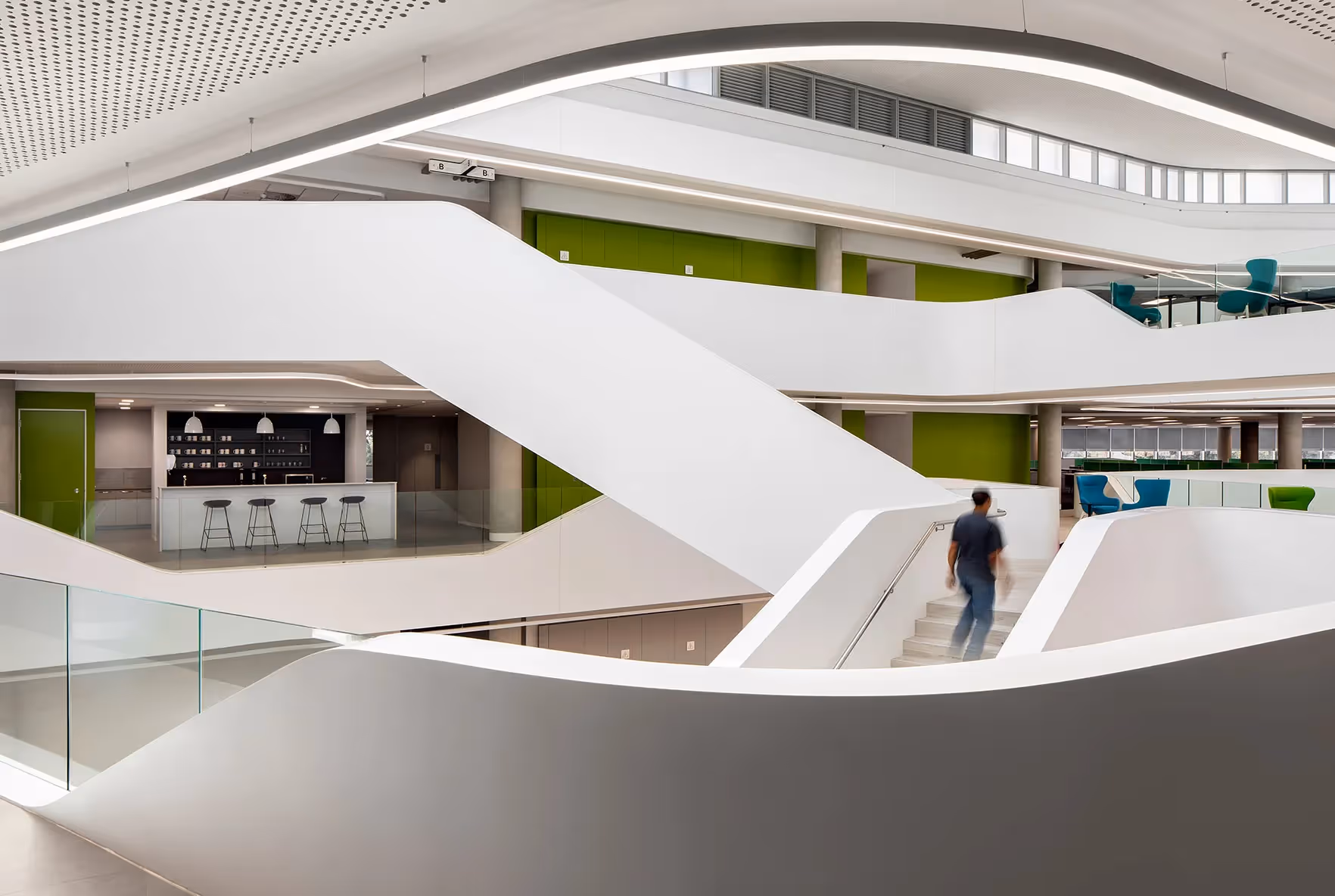 Completed in 2020, the three-storey superstructure wraps around itself, into a unique ‘doughnut’ shape. A central triple volume atrium acts as an internal social spine at the heart of the building. Internally, wide open-plan floorplates loop around the atrium’s periphery. This is an intentional design element to better connect the various departments, creating opportunities for chance collaborative encounters and personal interactions.