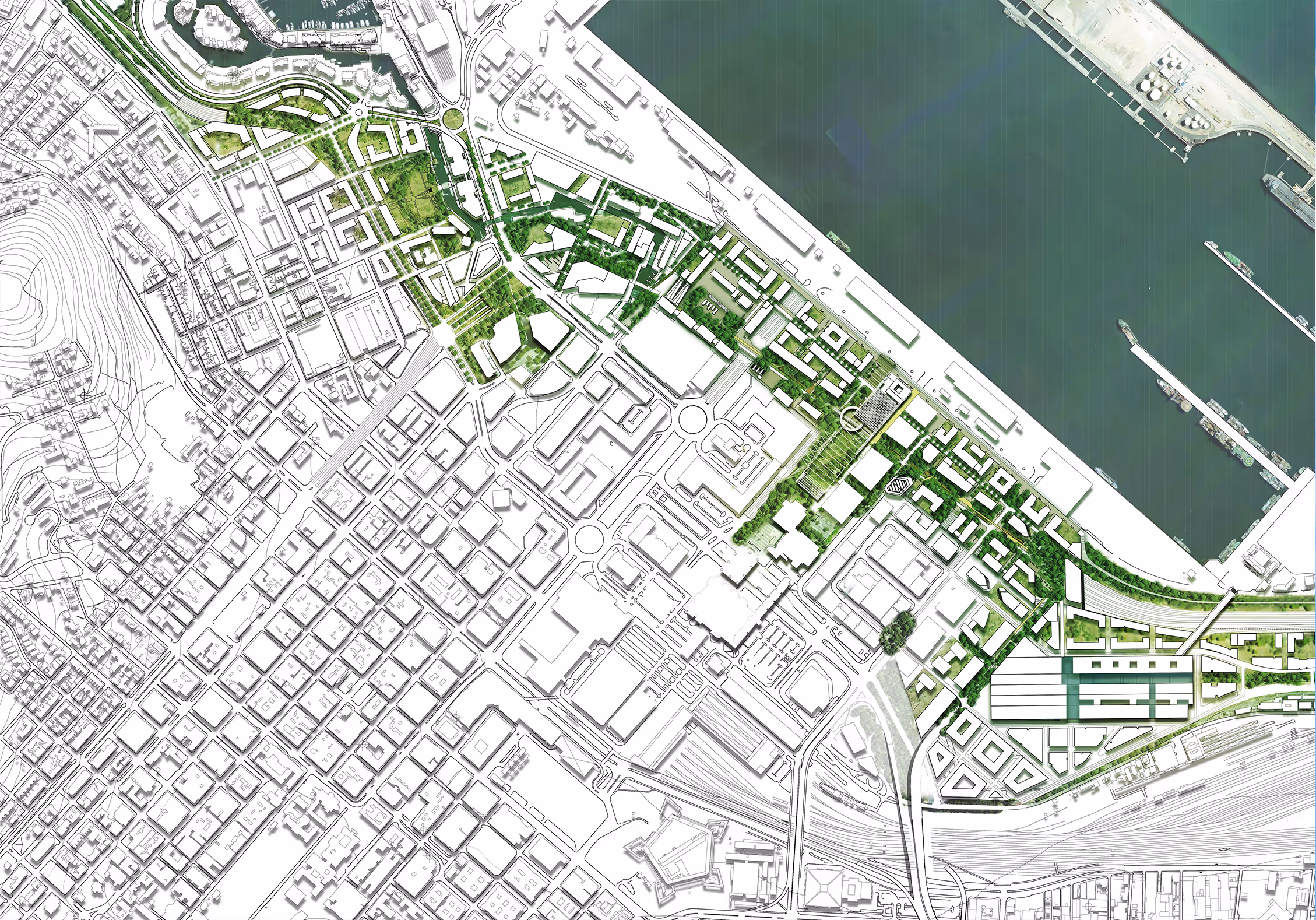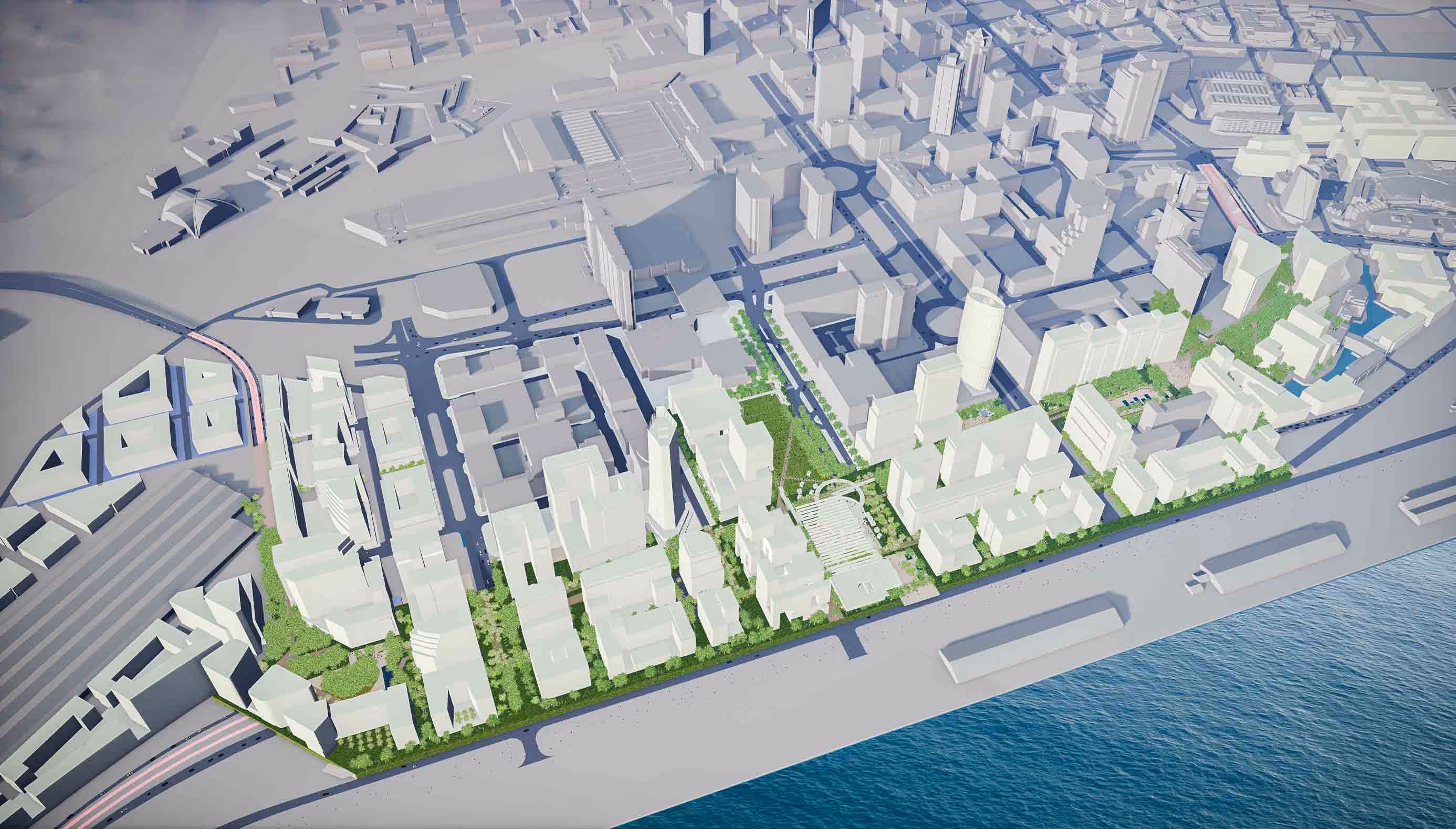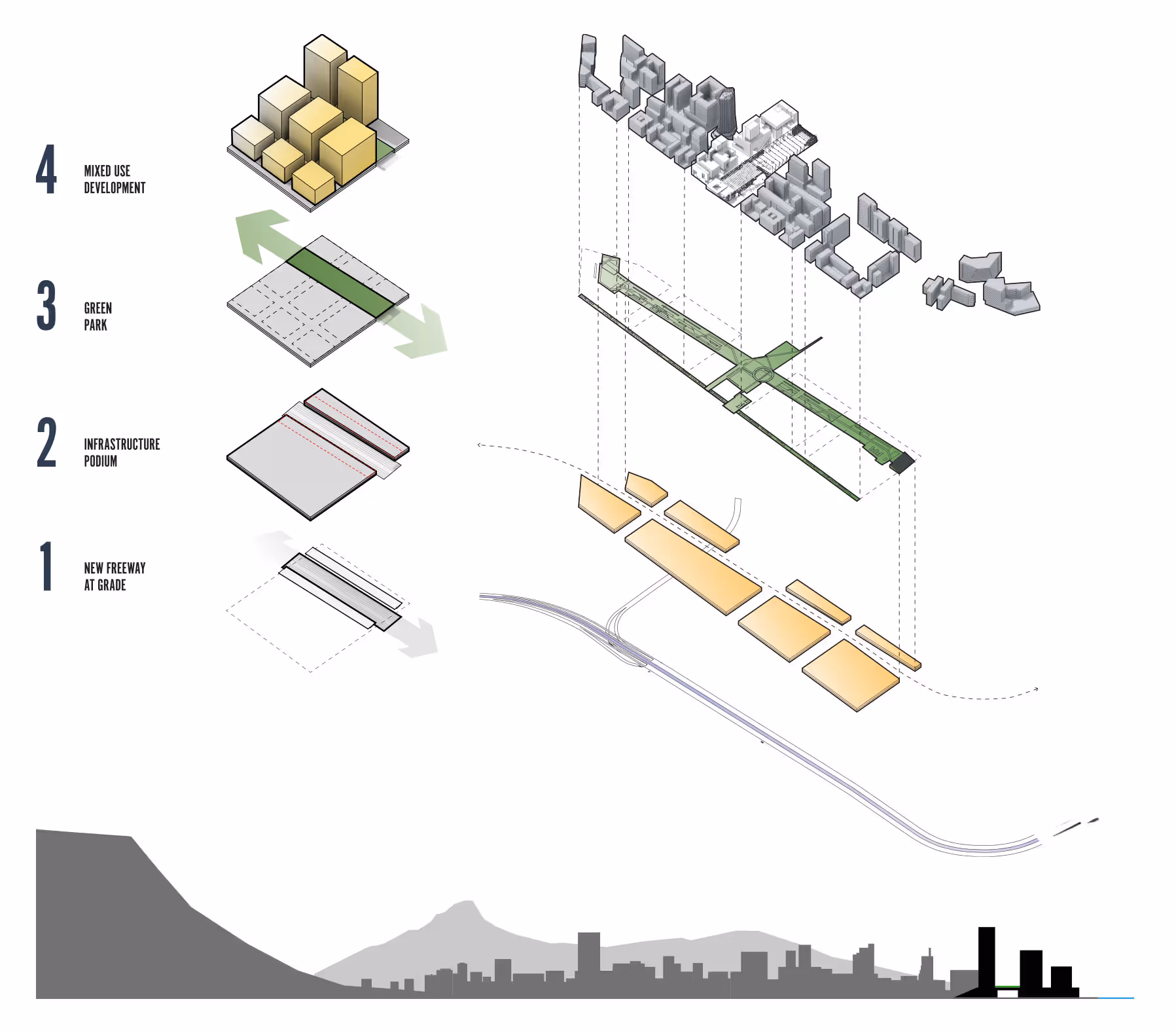 The plan had three components: extending the city to the harbour on the upper levels, creating strategic sub-surface underground mobility systems and developing a new linear park. The first step would be to lower the working freeway to the ground. The next step would be to demolish the elevated foreshore freeway, and finally, to gradually elevate the city up over the new ground-level freeway, raising and extending the city grid to about seven to ten metres above the existing ground level, which would lift the city above the moving public transport and cars below.