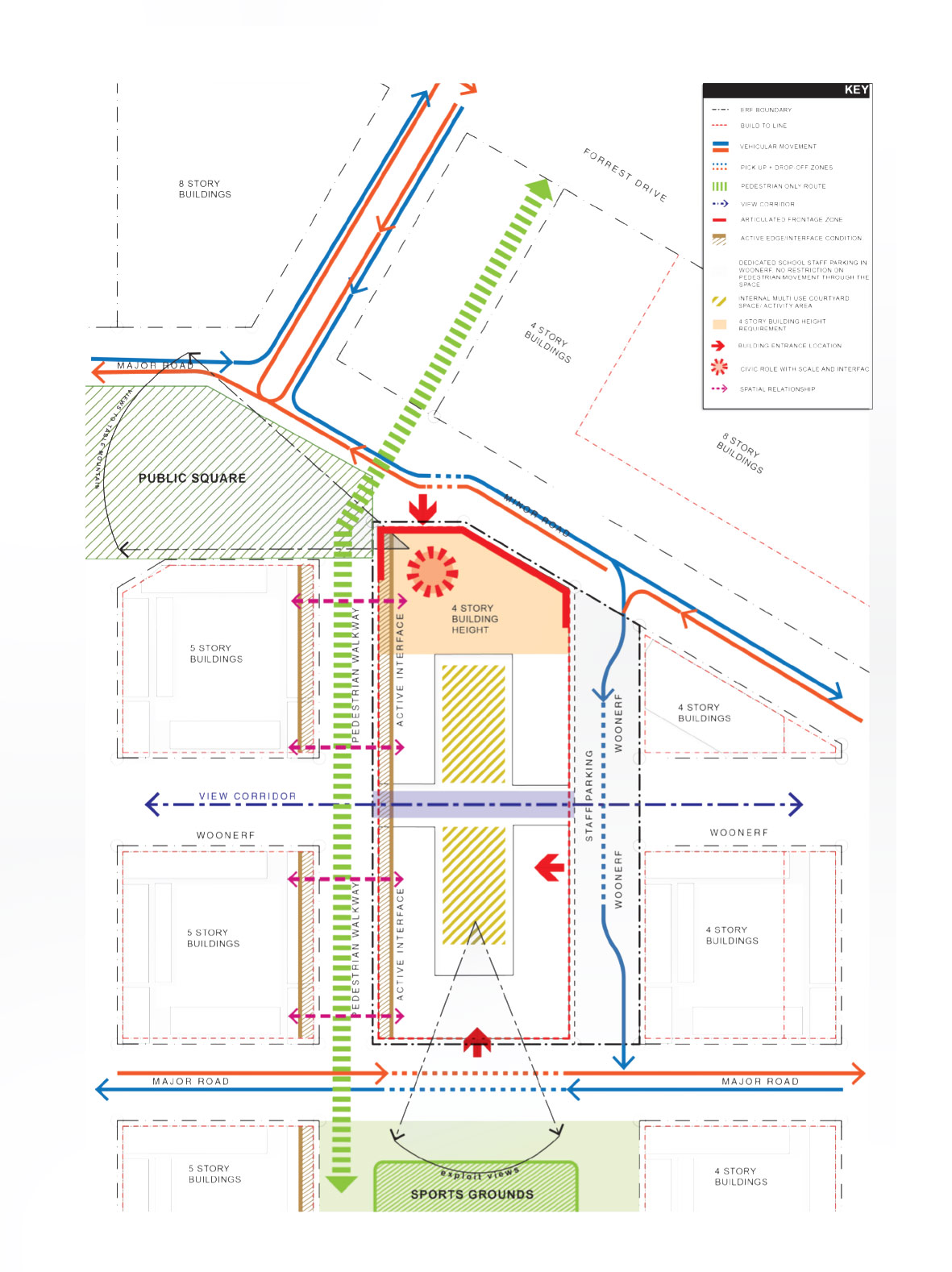 Small block sizes with a fine-grain network of streets and walkways facilitate permeability and strengthen the sense of neighbourhood. The scheme prioritises pedestrians with wide sidewalks, footpaths and cycling paths,