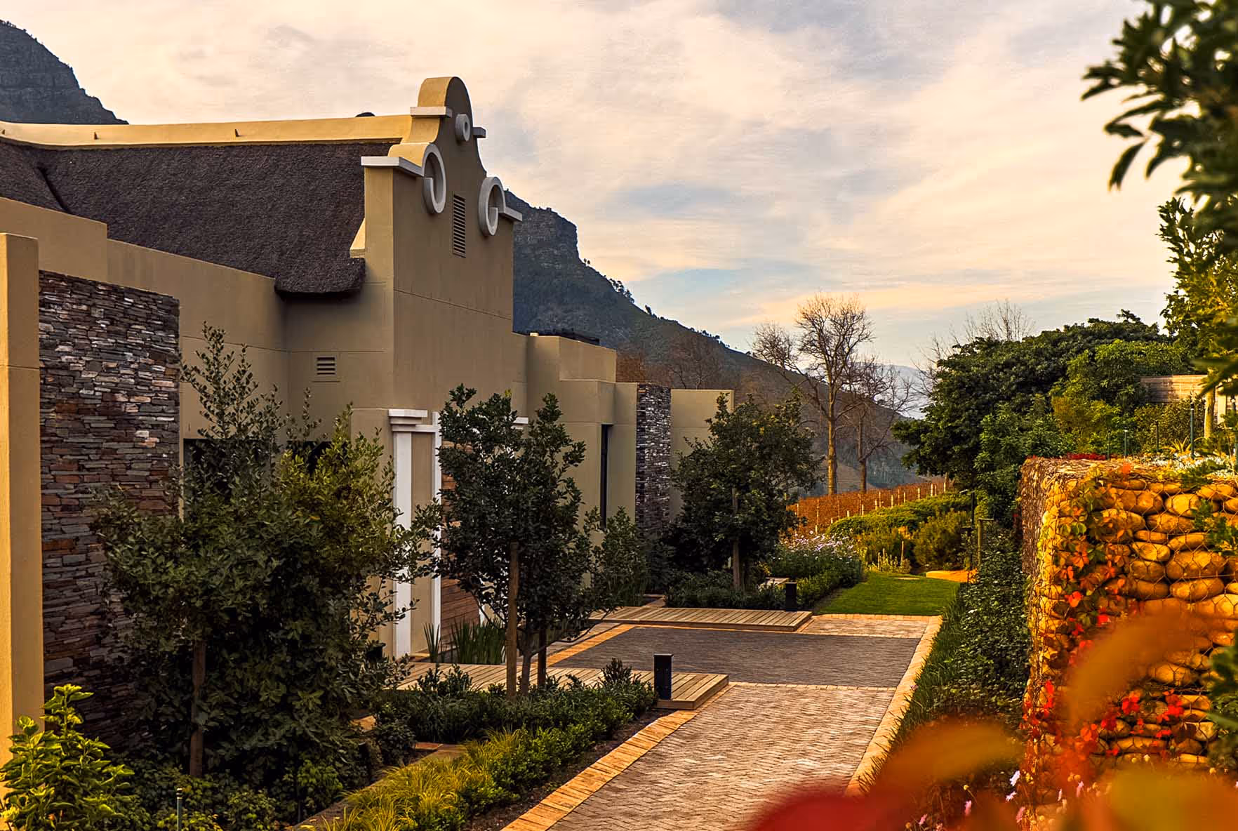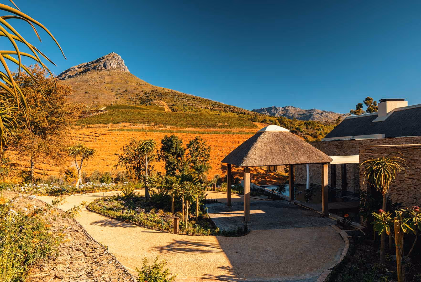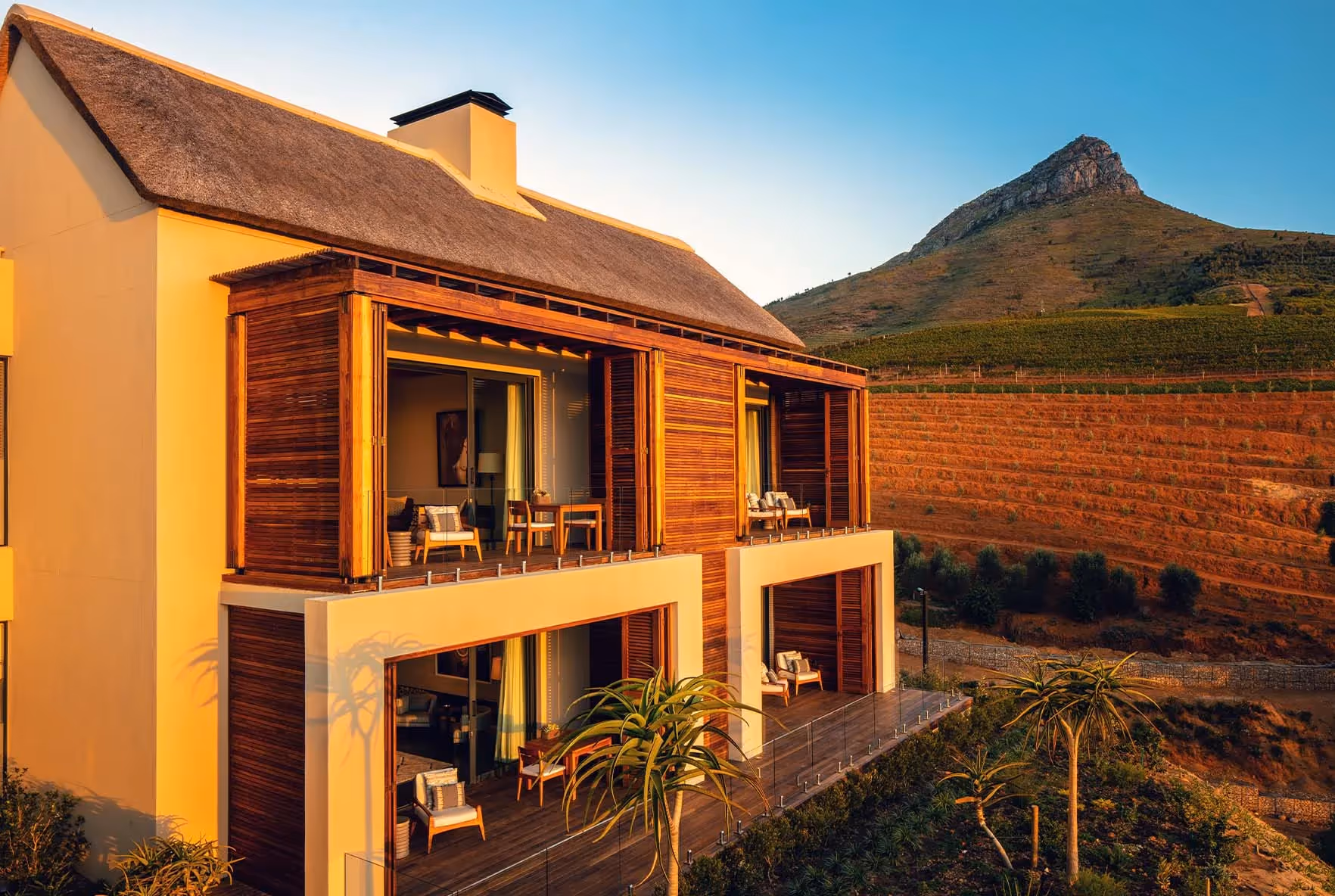 The brief from our client, Laurence Graff Wines, was to establish a new standard of luxury accommodation while creating closer connections to the greater estate. Refined and elegant, the villa and lodges are of exceptional quality with high-end finishes and careful detailing throughout. We introduced a selection of natural and raw materials, including solid French oak trusses, stone-clad walls, thatched roofs and extended timber terraces. The buildings further coalesce with the encompassing mountain and vineyard landscape due to the extensive landscaping.