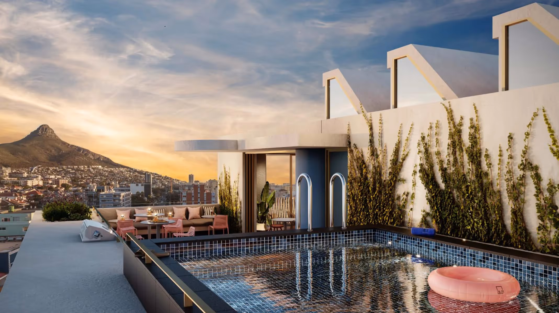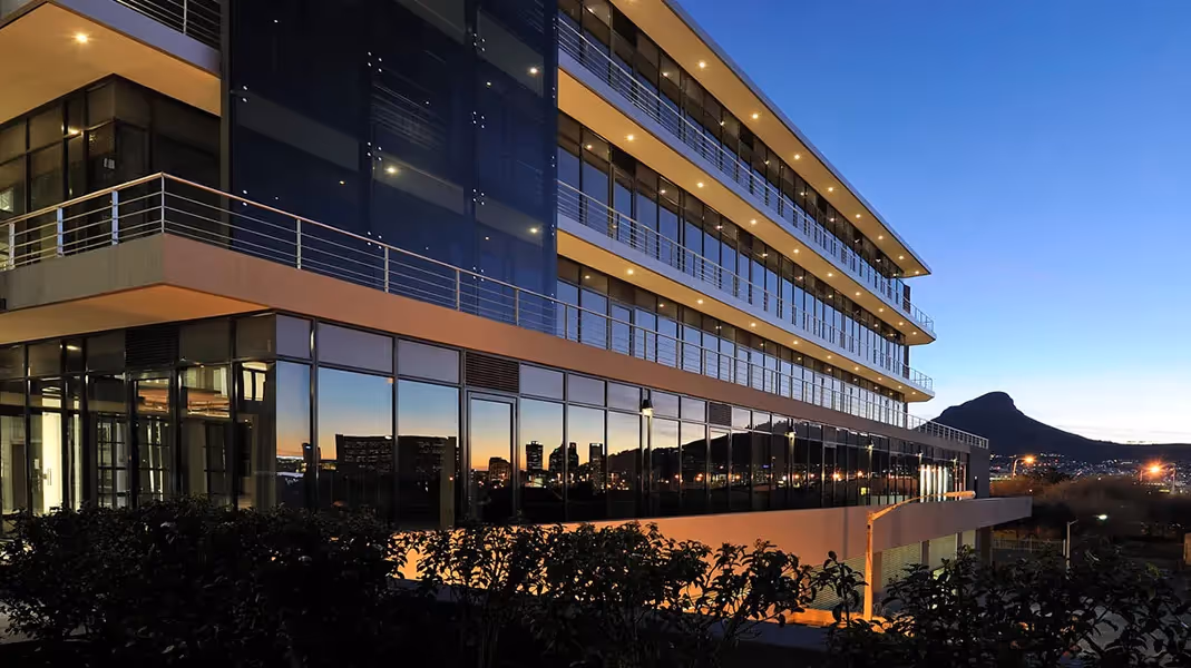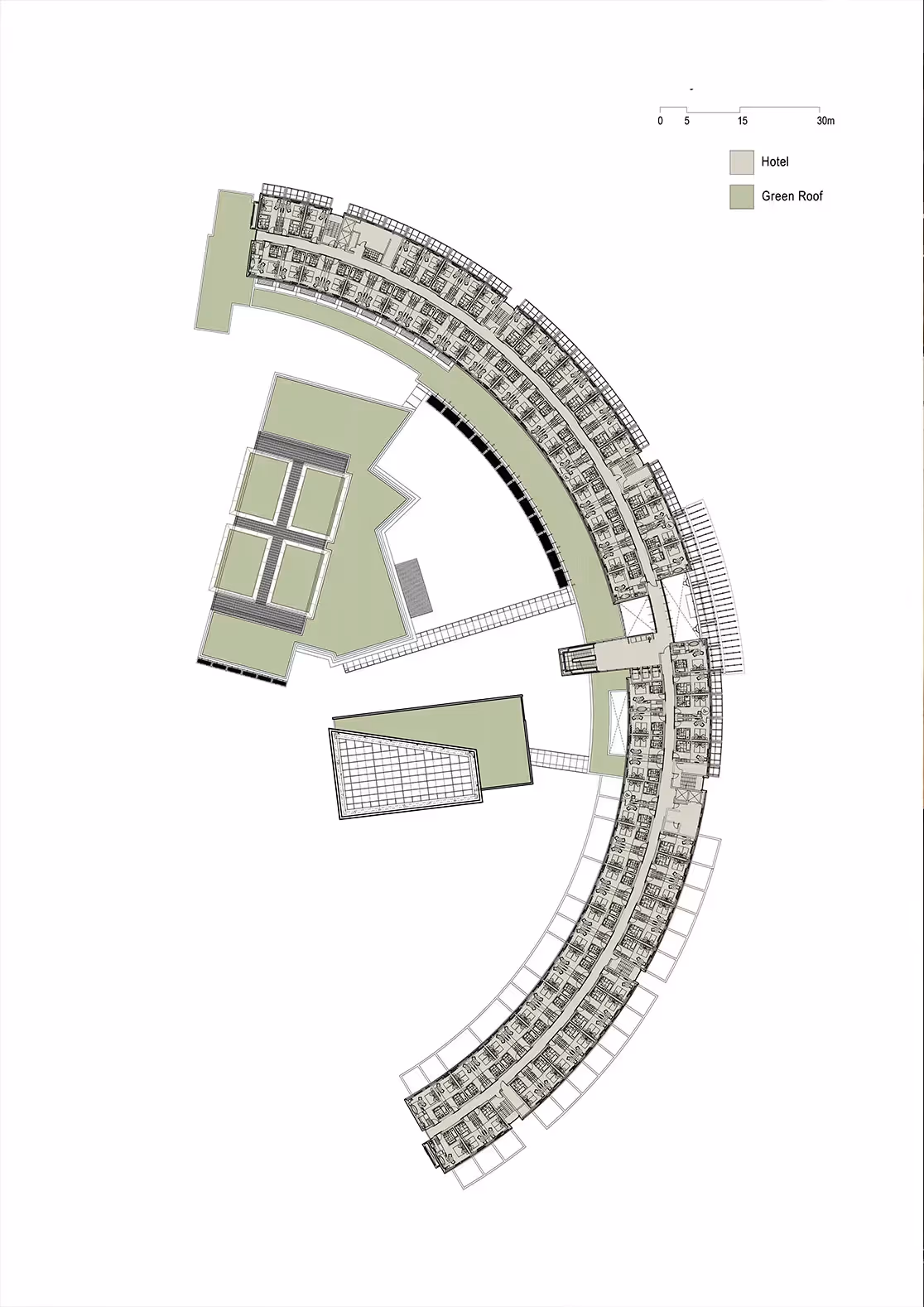 The semi-circular main hotel building is accessed off a landscaped parking forecourt that turns its back to the highway. The lowest floor of the three-storey building is constructed below ground level opening out to a garden and open space. Guests enter via a central steel and glass porte cochere into a highly transparent glazed treble-volume lobby on axis with the villa. The lobby houses a central reception desk, a lounge with bar, and a restaurant which all extend in a linear form. The back-of-house kitchen and support accommodation is located in the wing to the right. To the left wing are the administration office, baggage handling, garden suites and rooms.