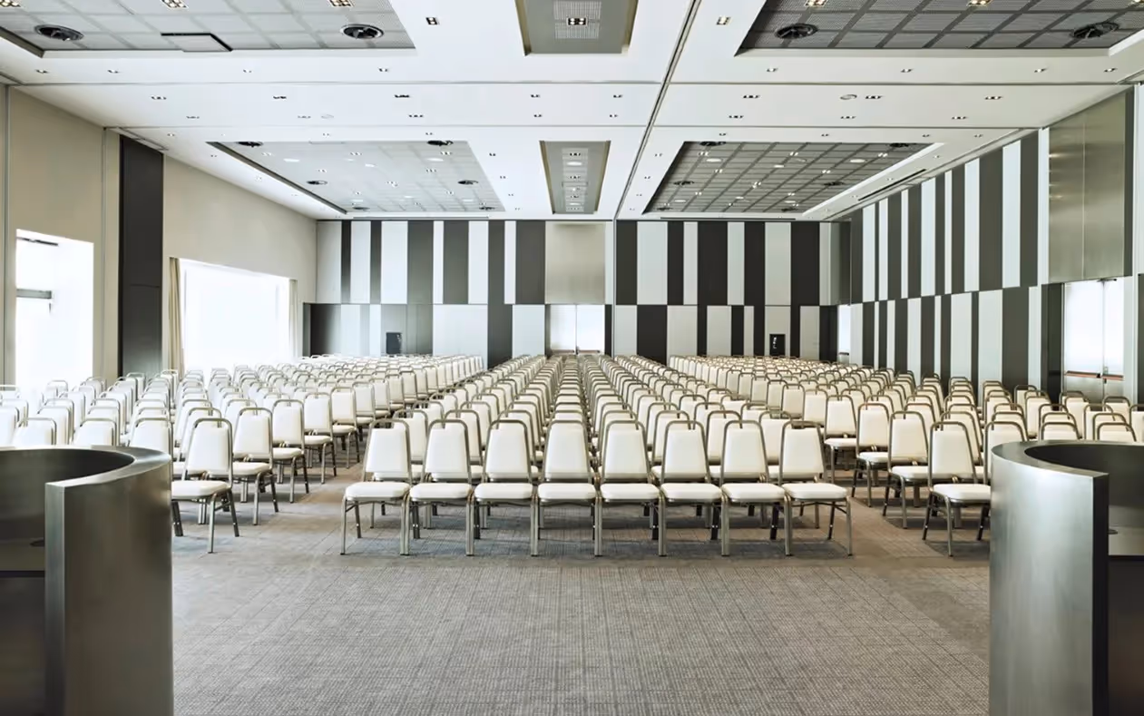 The strong geometric arc of buildings embraces and encloses the landscaped garden and courtyard spaces. A fully divisible multi-functional conference centre, assembly area, breakaway spaces and support facilities are all linked directly to the main kitchen and back-of-house areas. The gymnasium and indoor/outdoor pool pavilion and outdoor recreation areas are all set below ground level within a green landscaped park. This configuration completes the complex of buildings in the courtyard. The courtyard buildings are angular and orthogonal in plan, contrasting with the soft arc of the main building.