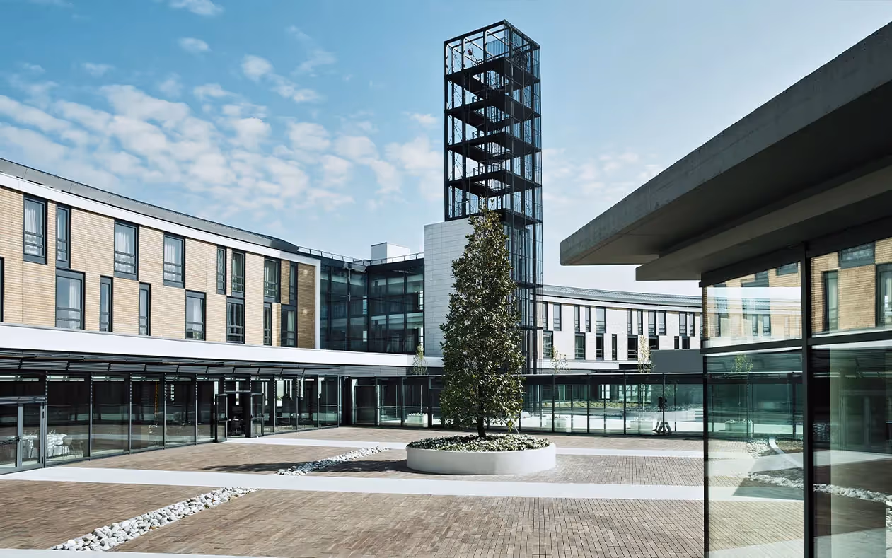 The main feature staircase is positioned to maximise the views to the central garden. It extends vertically to form a light weight semi-transparent, mesh clad campanile. The buildings pivot around this structure, easily visible from the highway beyond. Glass balustraded bridges link the upper wings of rooms on either side of the central volume. Externally, the rooms on two upper floors are defined by strong stucco frames housing a carefully structured alternating pattern of modular, vertical windows and natural timber panel infill.