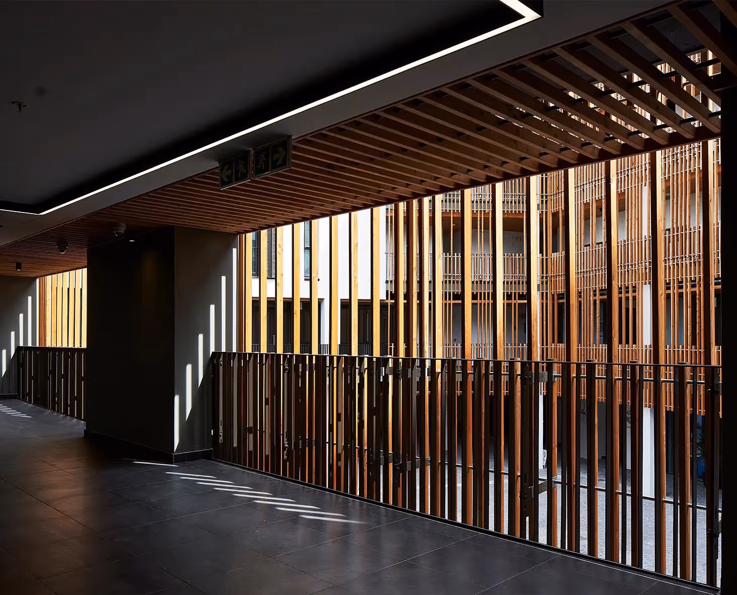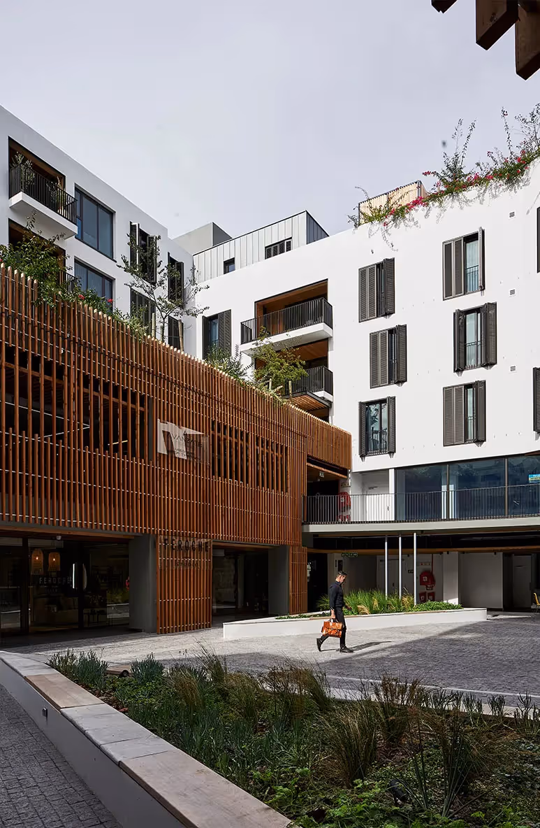 The development prioritises occupant well-being through optimised living and workspaces, improved indoor air quality and the use of non-toxic materials throughout. This focus on health and comfort contributes to an enhanced quality of life for residents and workers throughout the development. A timber brise-soleil creates an elegant screen that enhances privacy for the apartments on the upper floors.