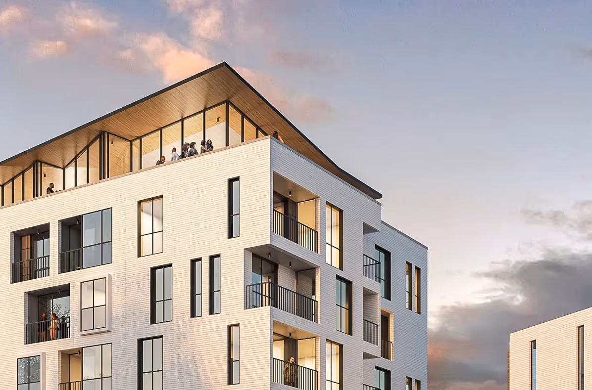 The design responds to the site’s sloping topography, resulting in a seven-storey block to one side of the site and a lower, four-storey construction opposite, respecting the zoning requirements and acknowledging the scale of the surrounding urban fabric. These buildings encompass around 600 units in studio, one-bedroom and two-bedroom configurations, designed around a large landscaped courtyard that creates an active social environment containing a gym, swimming pool and ball court. Mixed-used elements include co-working spaces, a coffee shop with meeting rooms and a spectacular rooftop restaurant and a bar