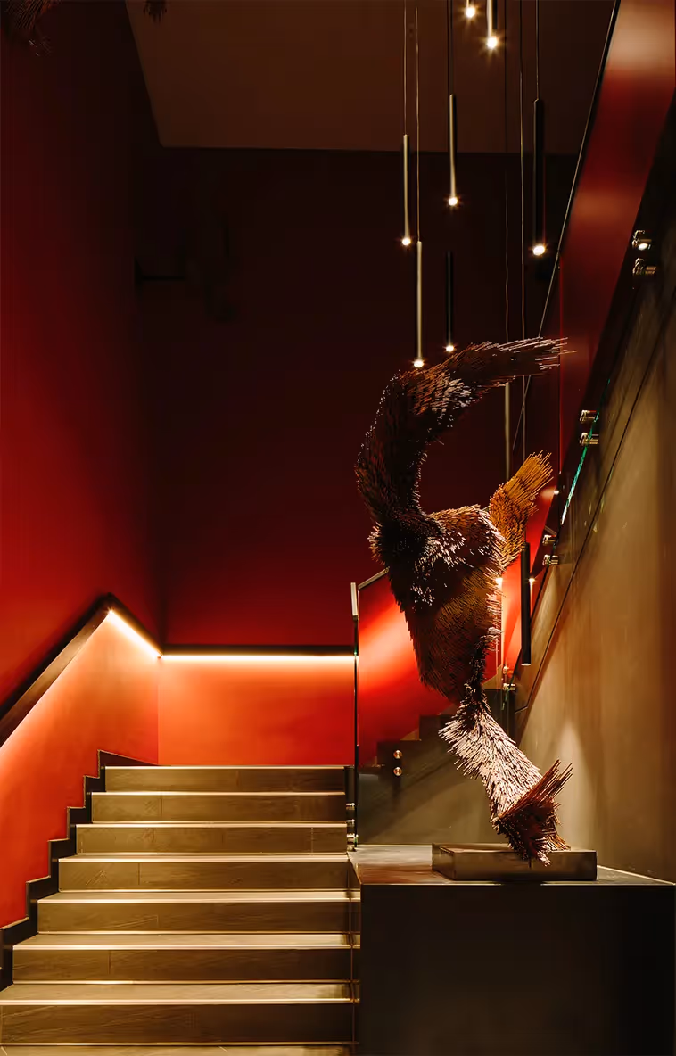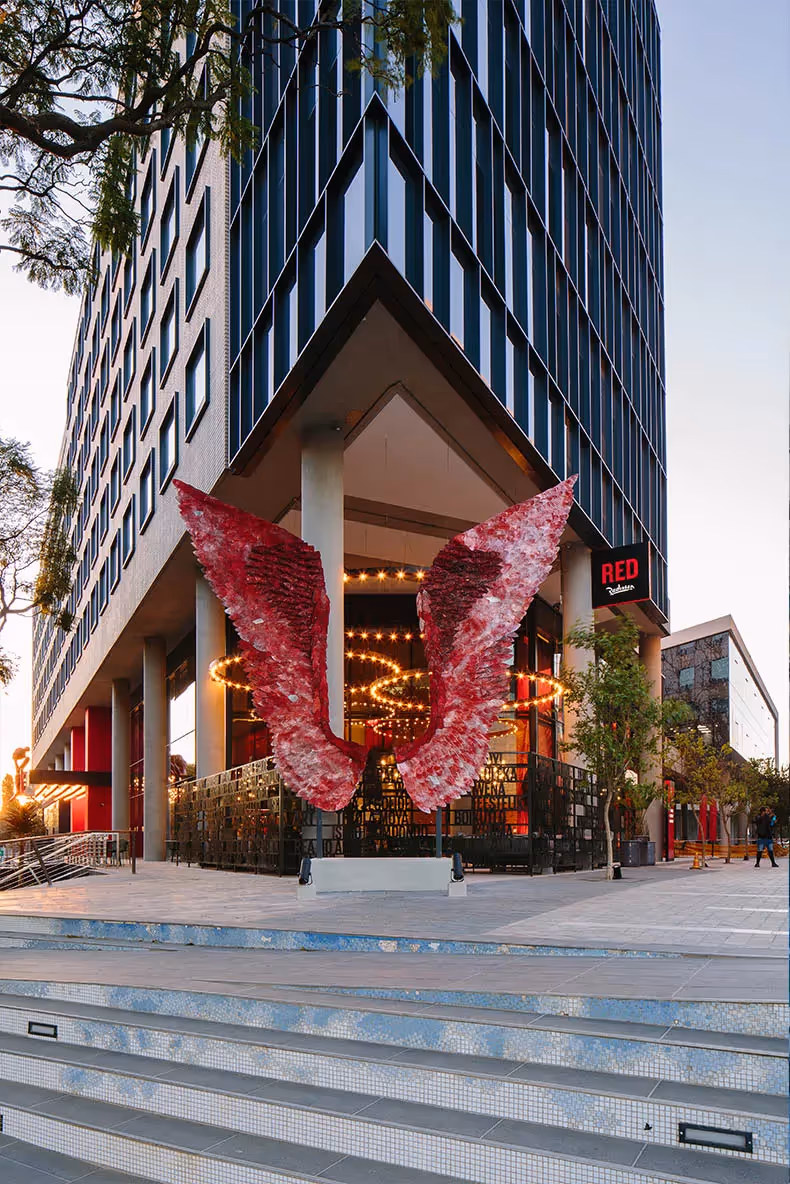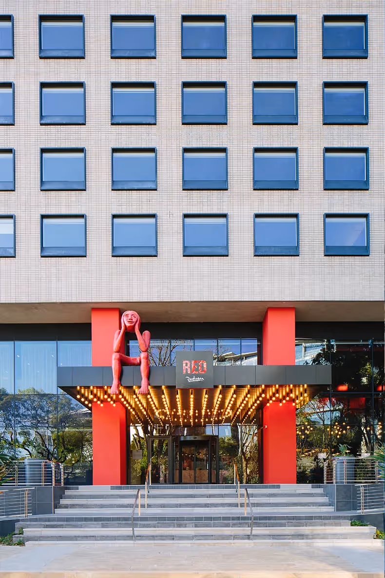 Art is a key feature. Bold red accents and sculptural red artworks reference the RED brand. A commissioned angel-wing sculpture by local artist Usha Seejarim forms a prominent landmark. Corridors, rooms and suites feature custom-designed wallpaper inspired by local people, art, music and fashion. Street-style art displays change regularly. An interactive digi-wall and Chromecast televisions offer high-tech visuals. The building adheres to ASHRAE standards for high thermal comfort. Its energy-efficient fittings also surpass SANS 10400 standards.