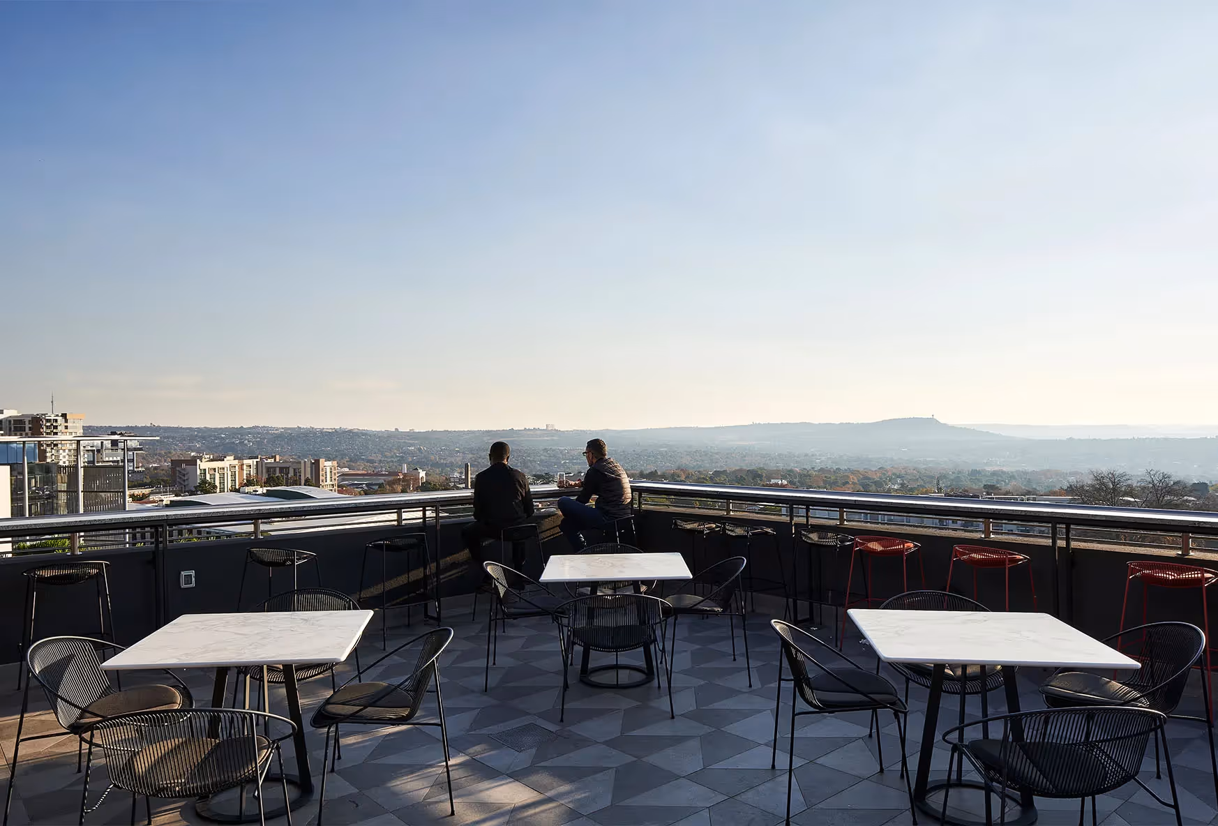 Radisson RED Rosebank holds pride of place in the Oxford Parks precinct in Rosebank, Johannesburg. The brief from Intaprop for Radisson RED Rosebank was to create an architecturally sophisticated hotel with a playful tone. Oxford Parks emerged from the Dunkeld Design Manual, an urban masterplan which we developed to harness the strengths of Rosebank’s walkable urban realm and to connect the centre with others beyond. Key characteristics of the masterplan are human-scale architecture with striking façades and active street frontages. Radisson RED delivers on both points.
