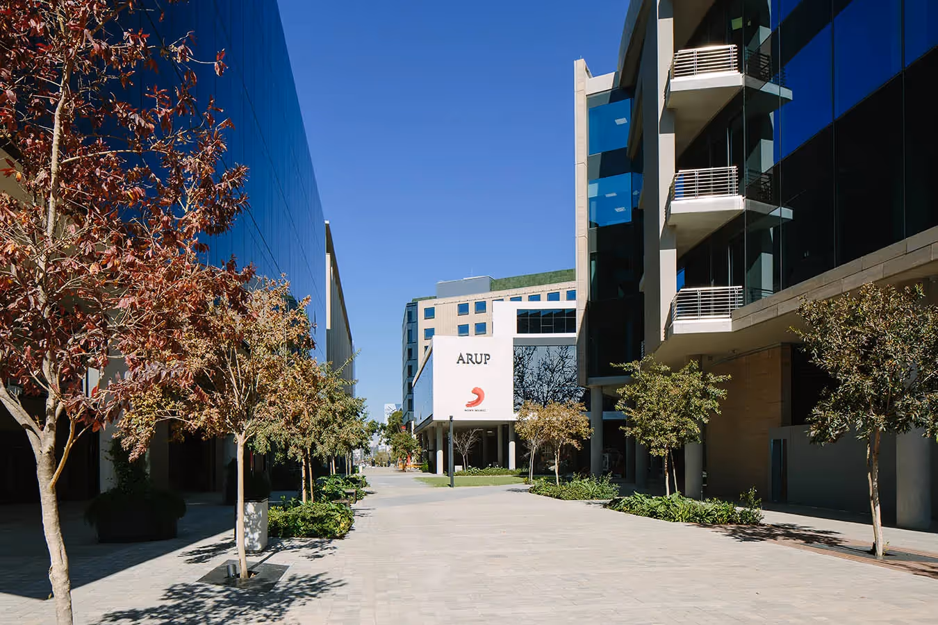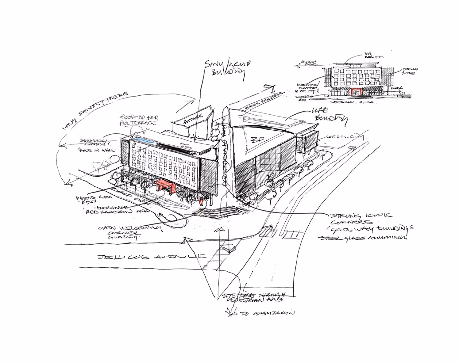 The hotel comprises 222 keys, a restaurant, bar and rooftop terrace and a generous reception area accessible from the pedestrian hub of Oxford Parks. The grand full-height entrance canopy creates a striking sense of place, highlighted with public artworks and halo pendant lights. Ground-floor volumes are visually transparent to increase internal/external interaction, reinforced by interior spaces that spill over into undercover outdoor seating areas. Illumination at night magnifies the visual impact