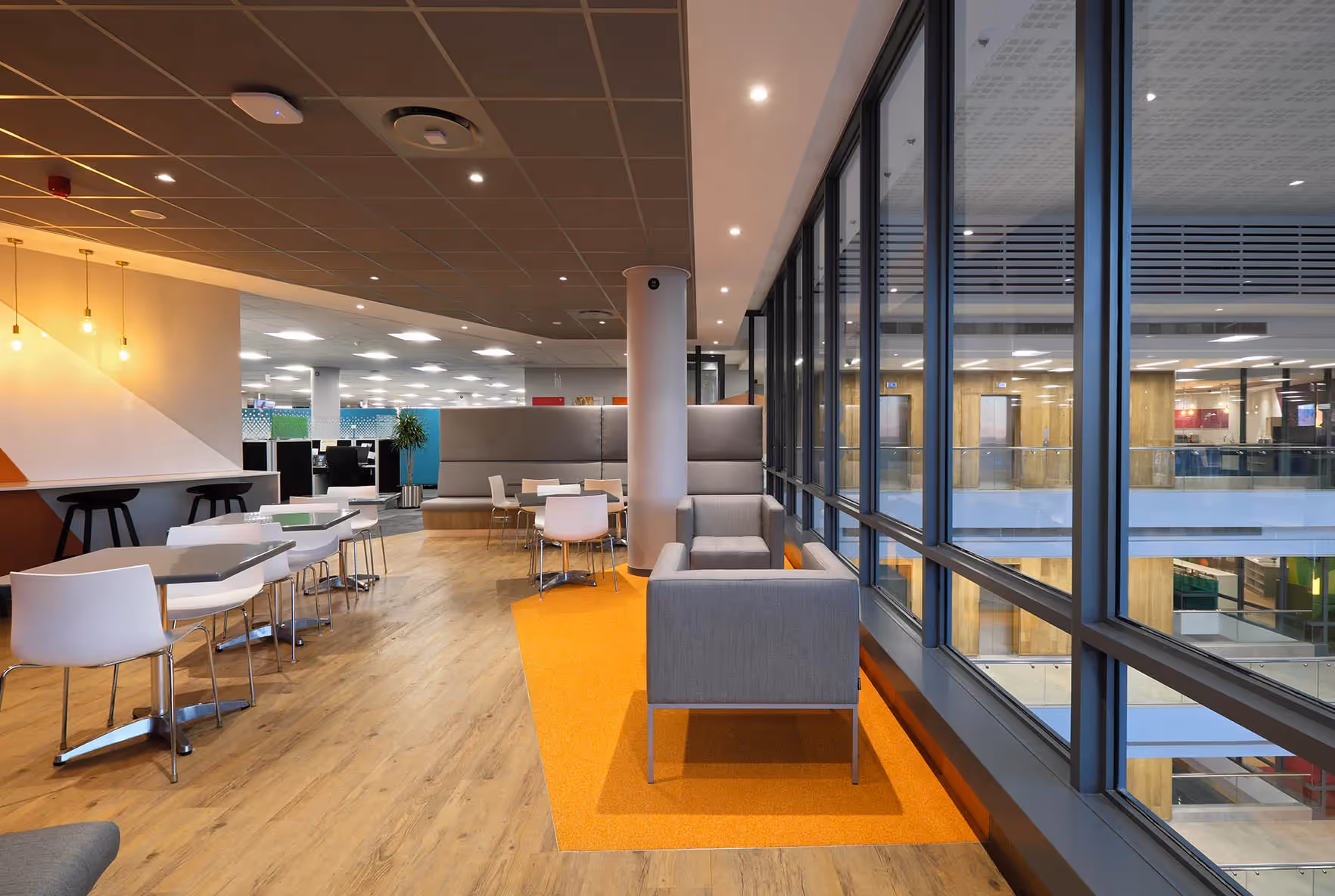 Internally, the buildings have two wings with a central core and full height atrium bringing light into the centre of the expansive floor plates. The wings are connected by a series of bridges spanning across the atrium at the edge of the main core. The core is a stand-alone element which is exposed on both sides of the building. From the rear, this concrete cube protrudes and is visible from over a kilometre away. It forms the proverbial ‘heart’ of the building, circulating people left to right, up and down and into different chambers in the building.