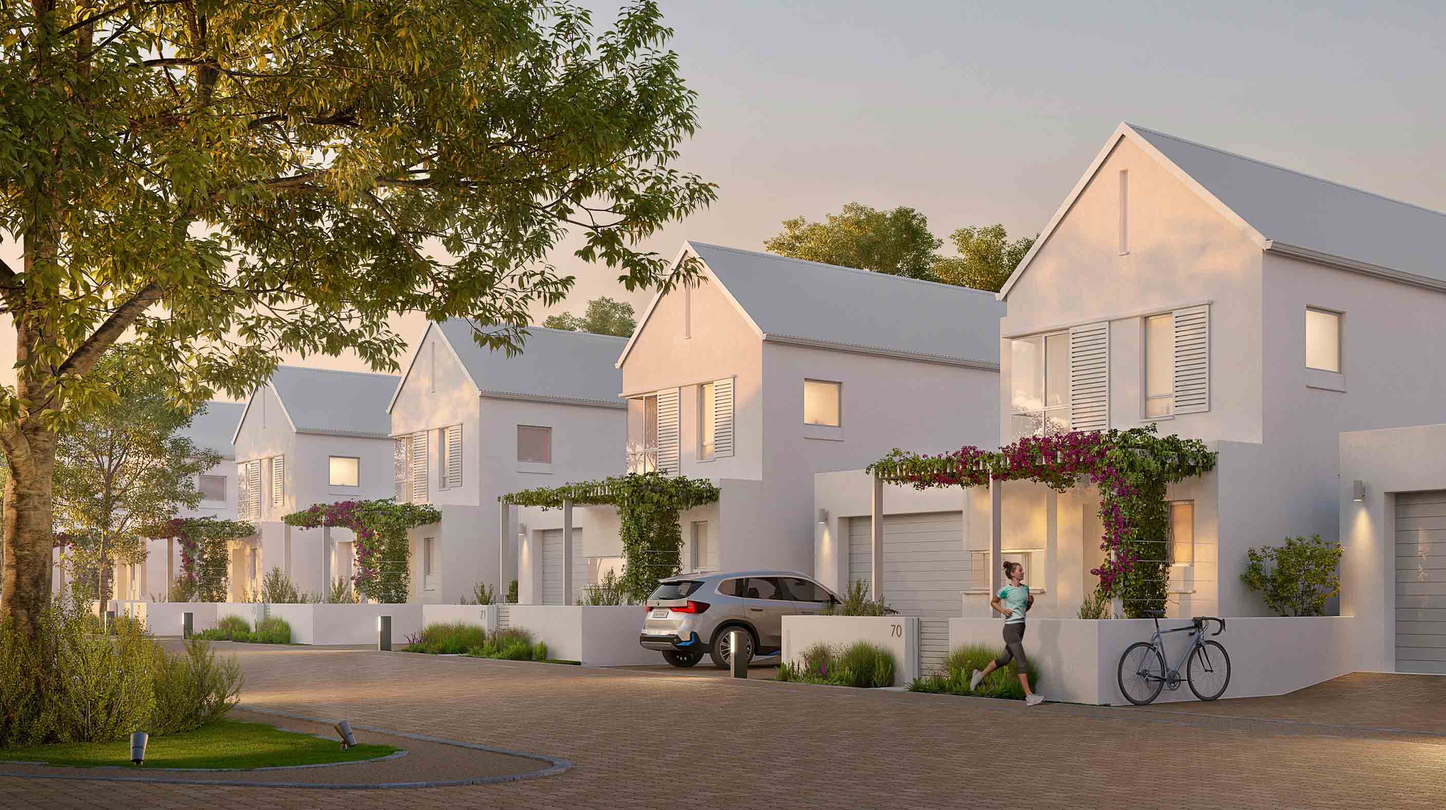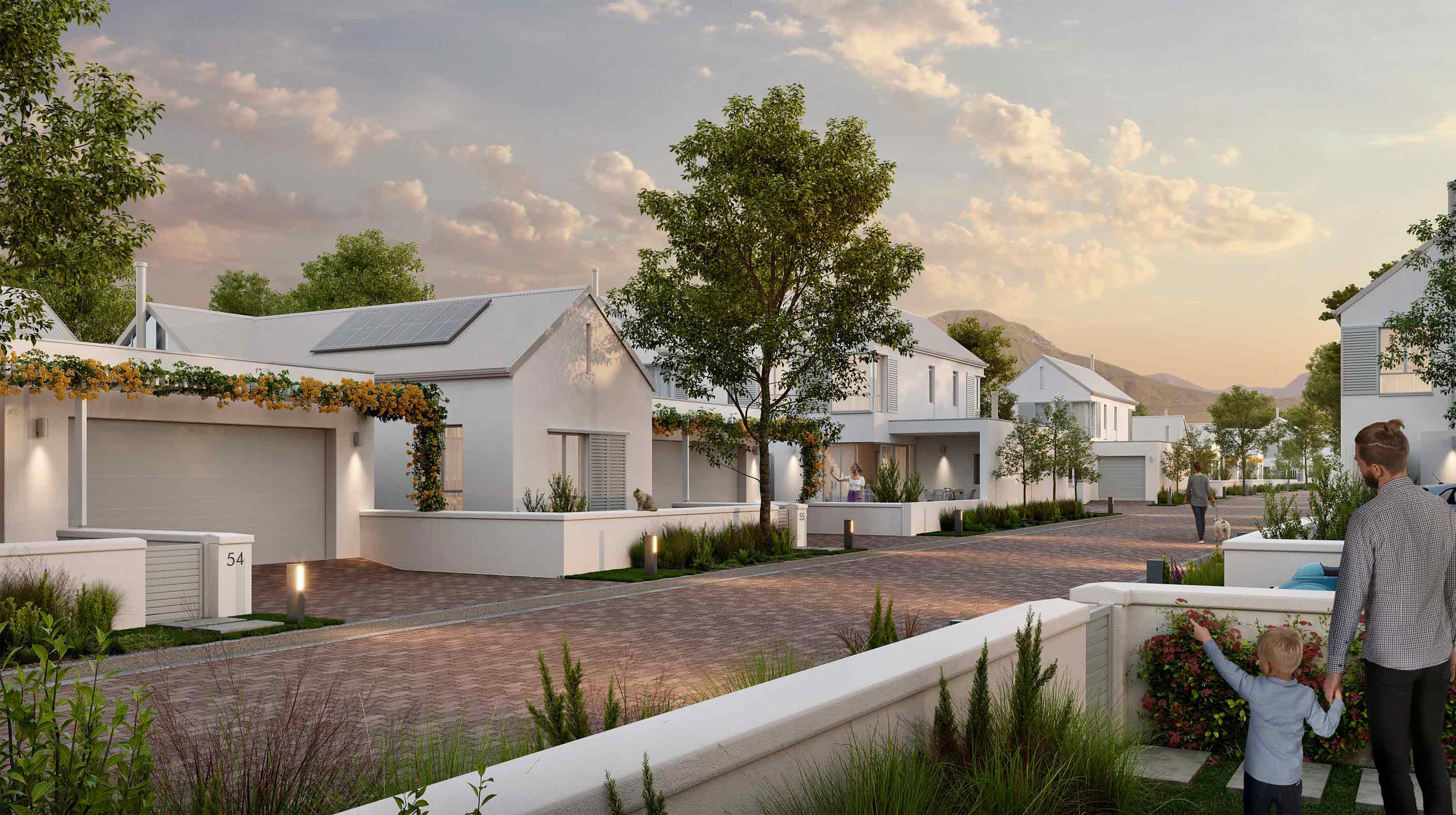 The design guidelines ensure a harmonious streetscape while allowing for individual expression in home design. Comprising 239 homes, Springfield presents a range of property sizes to cater to diverse needs for end users. Larger erven are strategically placed along the perimeter, providing a natural buffer between the community and surrounding roads. This principle of openness and connectivity is evident in the treatment of front gardens. Low werf walls, inspired by Cape Dutch architecture, define property boundaries without creating barriers, fostering a sense of connection between homes and the street.