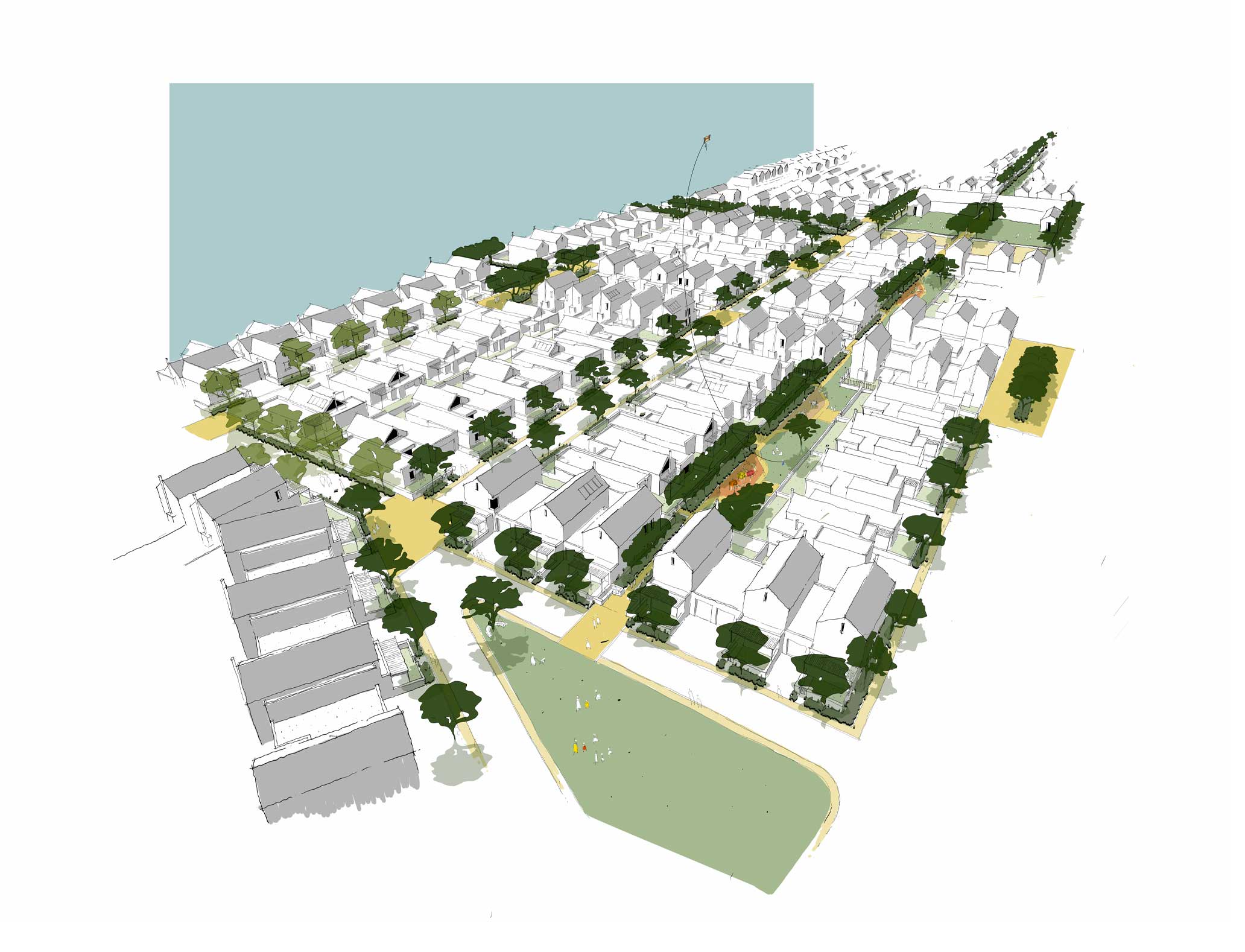 A standout feature of the plan is the approach to public spaces. Streets are designed as shared spaces, without traditional kerbs, where pedestrians and cyclists take precedence over vehicles. A network of green strips between houses provides access to semi-private play spaces. This creates opportunities for residents of all ages to enjoy outdoor recreation and social interaction.