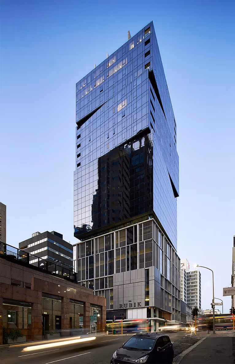 The Rubik is a 27-storey mixed-use tower designed for Abland Property Developers. The developers wanted a viable yet unique design for a modern mixed-use building on an 821m2 site that straddles the historical inner-city district and the more recently developed city blocks north of Riebeek Street in Cape Town’s CBD. The design needed to address the challenge of its location in a Heritage Overlay Zone and required approval from heritage authorities. The result is a distinctive form that rises to 91 meters. While exceeding initial height restrictions, the resulting approval led to a building that enhances the city skyline with its dynamic sculptural elegance.