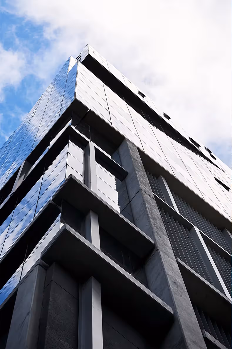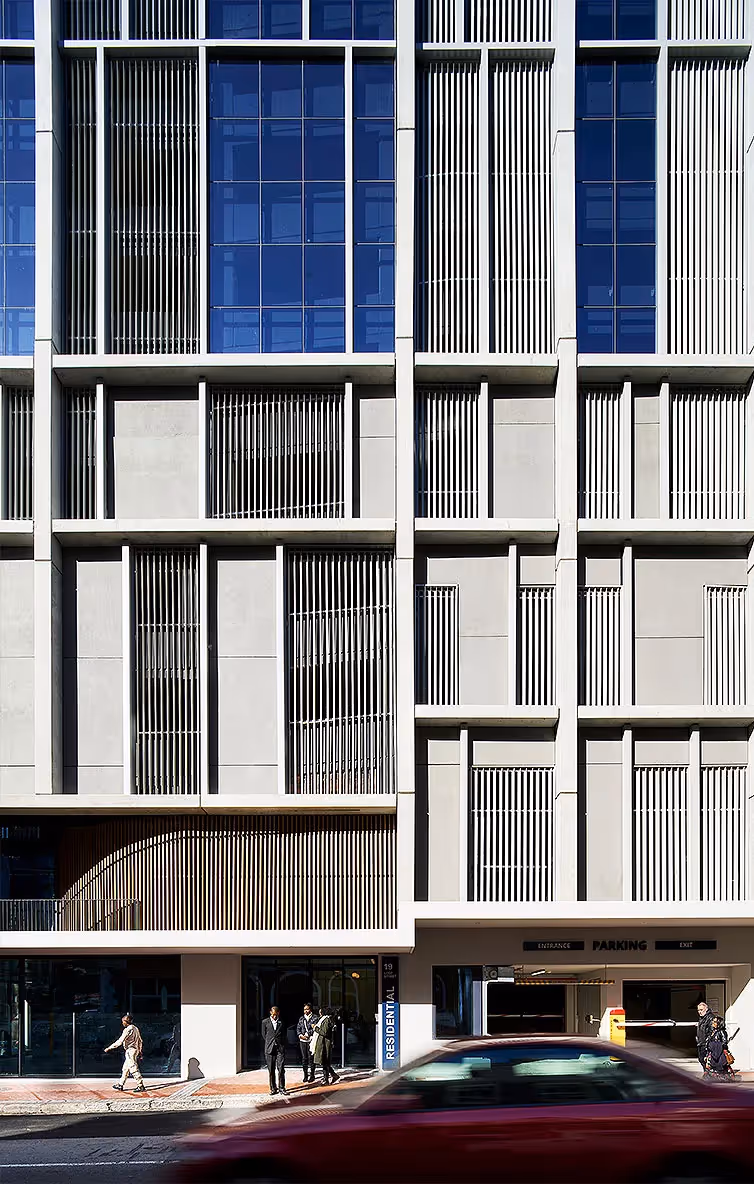 The façade design is thoughtful and contextual. The parking podium’s exterior references the scale and rhythm of nearby heritage buildings, using a combination of pre-cast concrete, extruded aluminium, and glazed panels. The office and residential levels feature flush glazing co structural elements and incorporates discreet balconies.