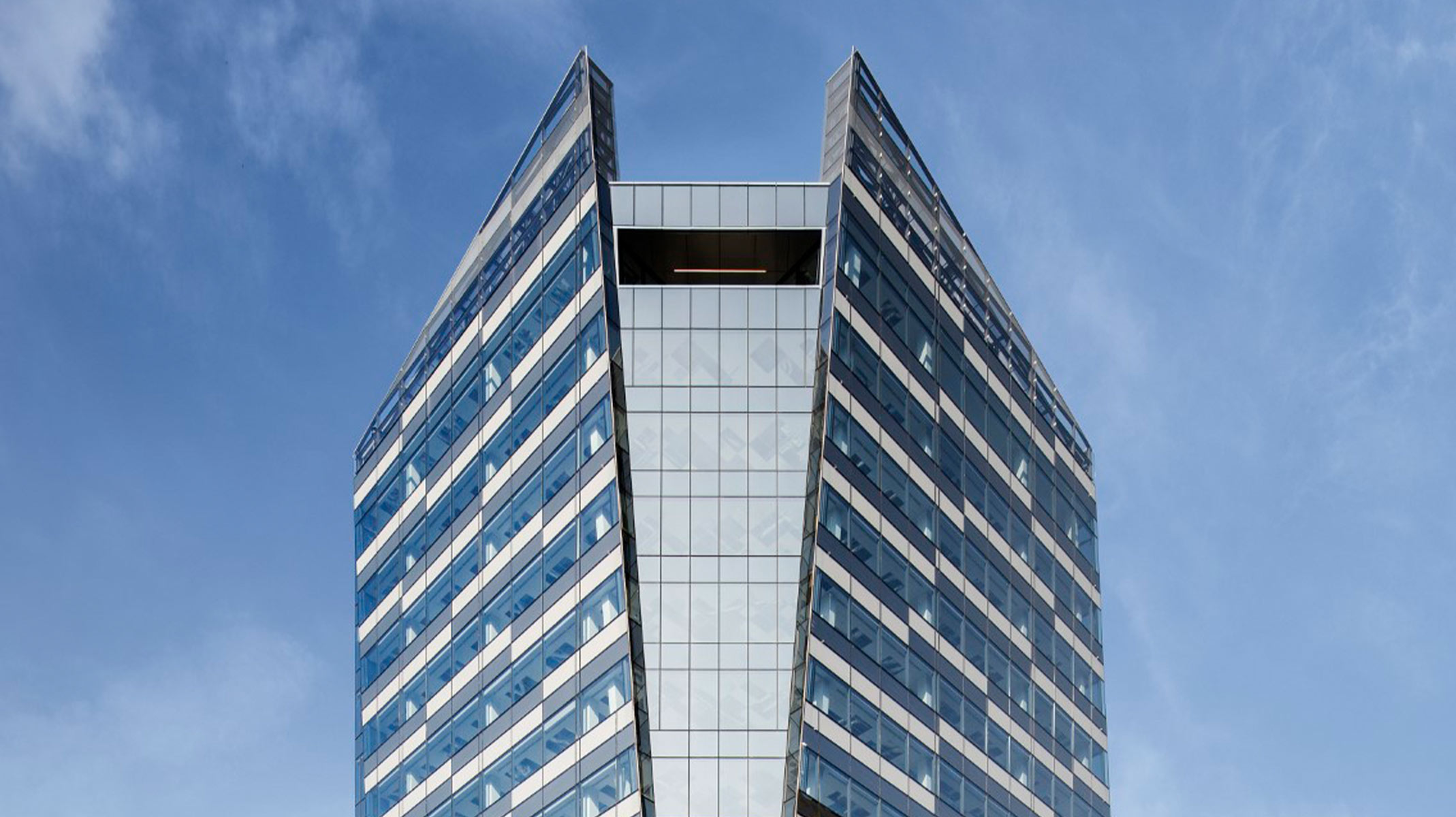 Retail spaces activate the streetscape from ground to first floor and the parking podium rises ten floors above. The upper levels, from floors 11 to 26, are divided into three stacked,orthogonal twisting cubes rotated around a central axis. These levels contain commercial offices and residential apartments, including one- and two-bedroom units, duplex and triplex penthouses. The fragmentation creates visual interest and captures varied reflections of the surrounding cityscape. Small recessed terraces punctuate the facade, adding to the building’s aesthetic.