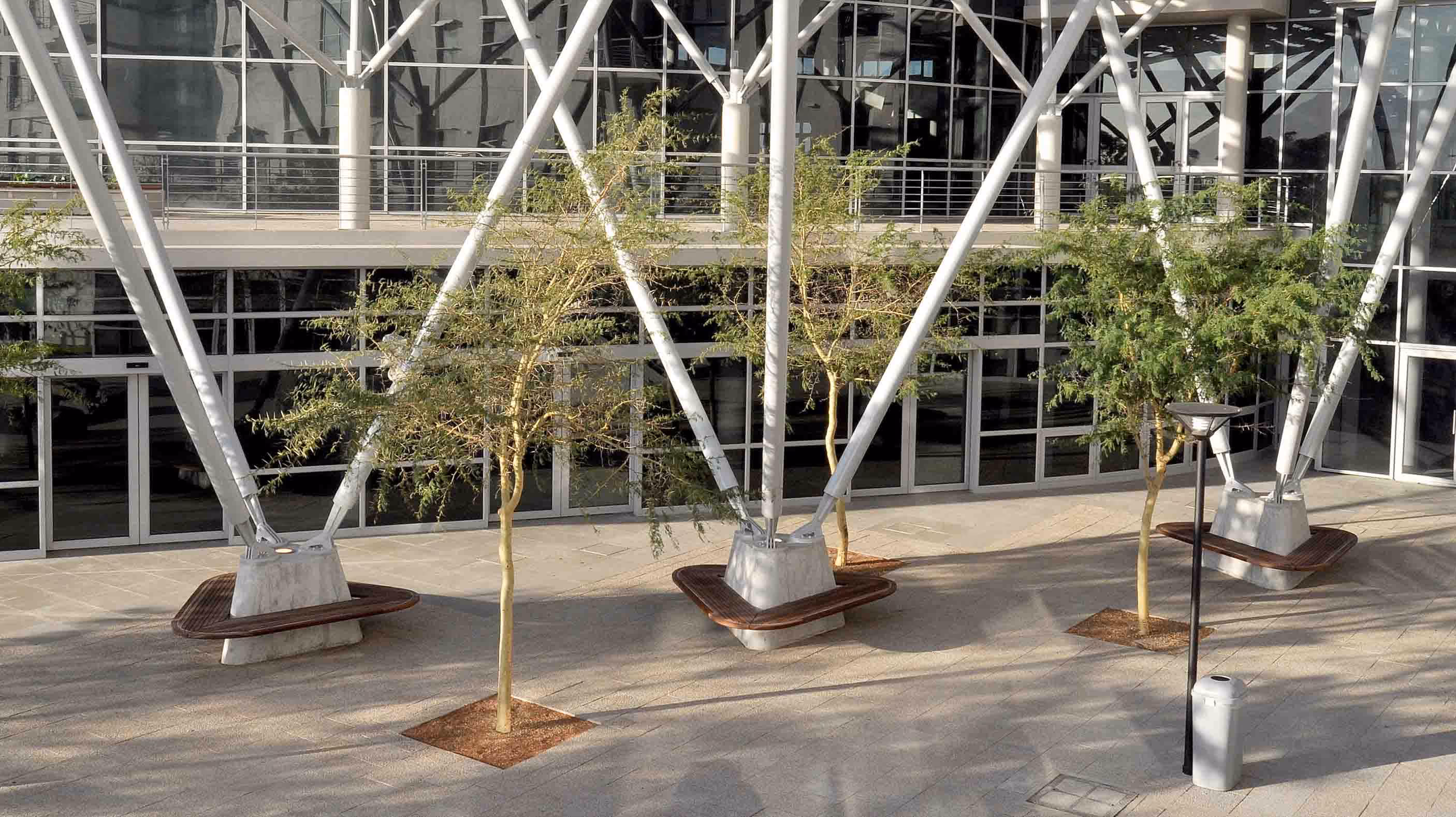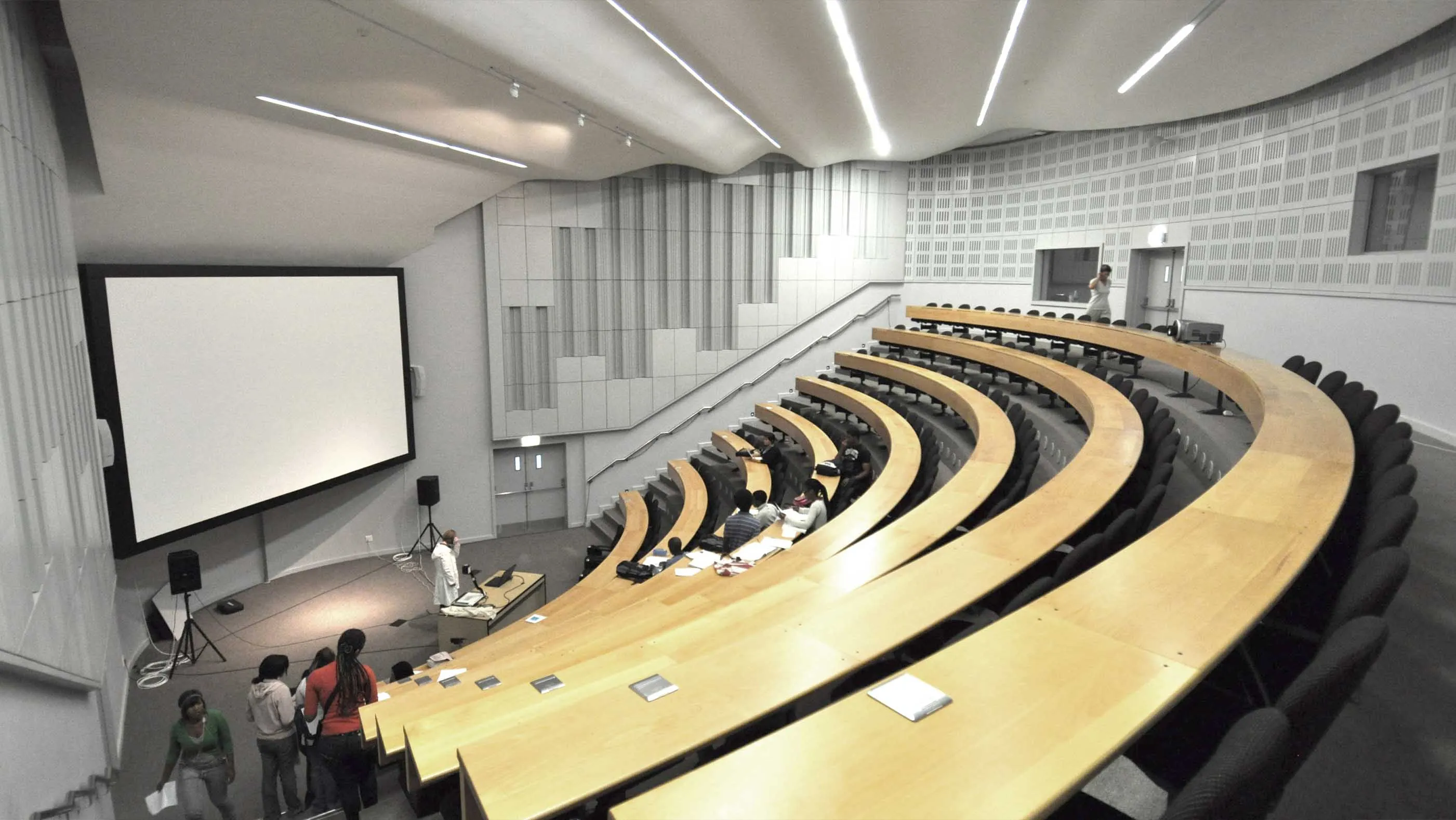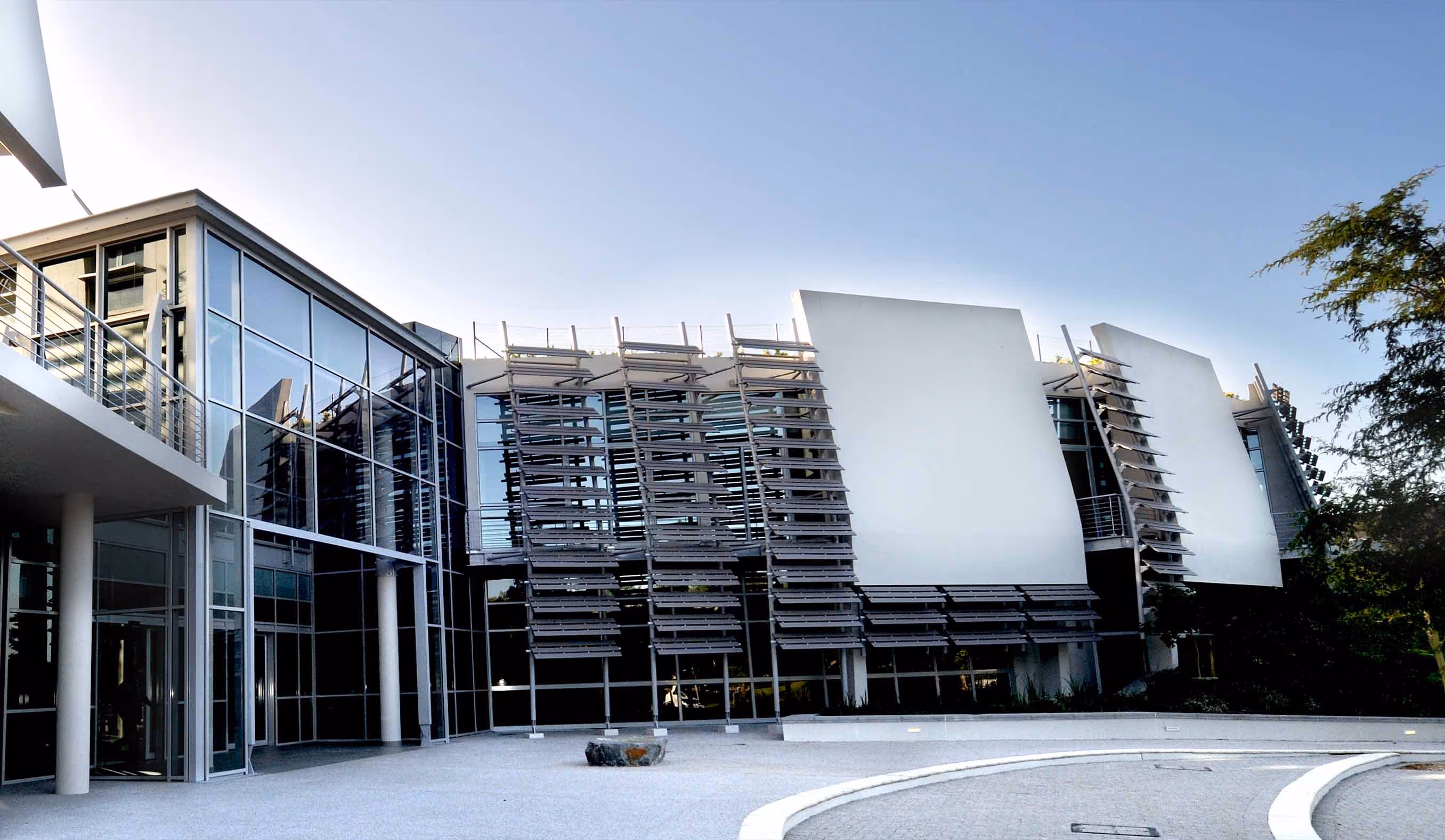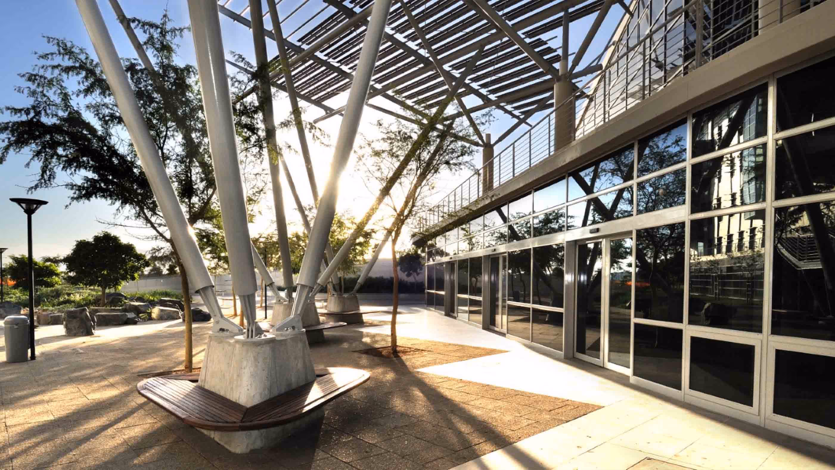 The design comprises two distinctly different buildings joined by a multi-volume glazed entry lobby. The lobby leads into a gathering space that is shaded by trees and over-sailed by a dynamic shading canopy supported on tree-like columns. The laboratory building is constructed from conventional reinforced concrete which contrasts against the curved plan and irregular column grid of the learning centre. An innovative system of shading structures was designed for the north-east and east façades.